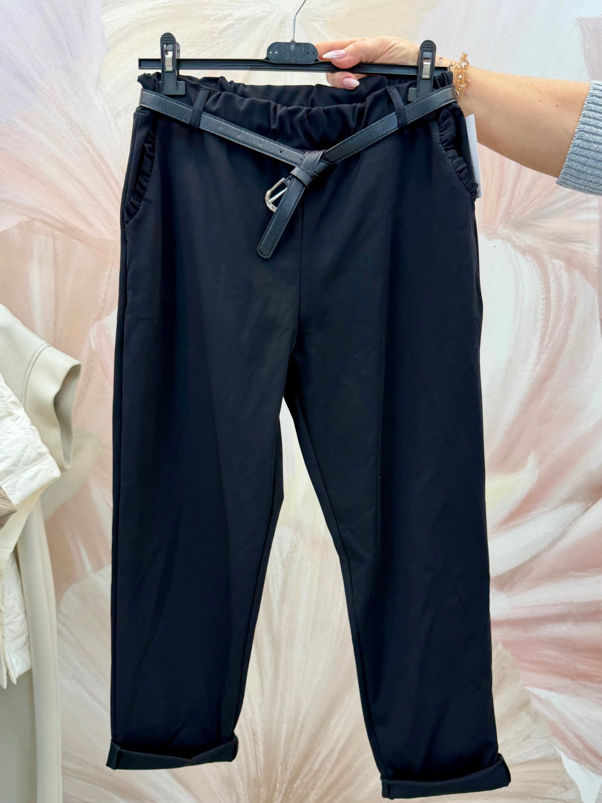 Elasztikus fekete nadrág fodros zsebbel, övvel