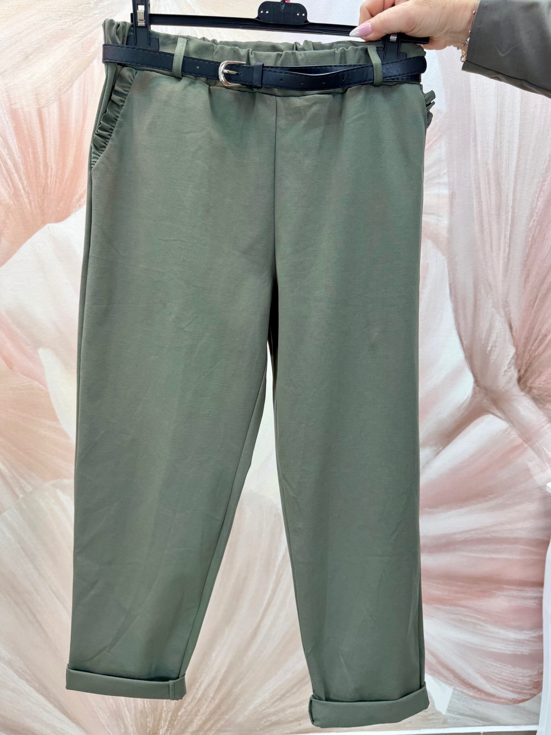 Elasztikus olívazöld nadrág fodros zsebbel, övvel