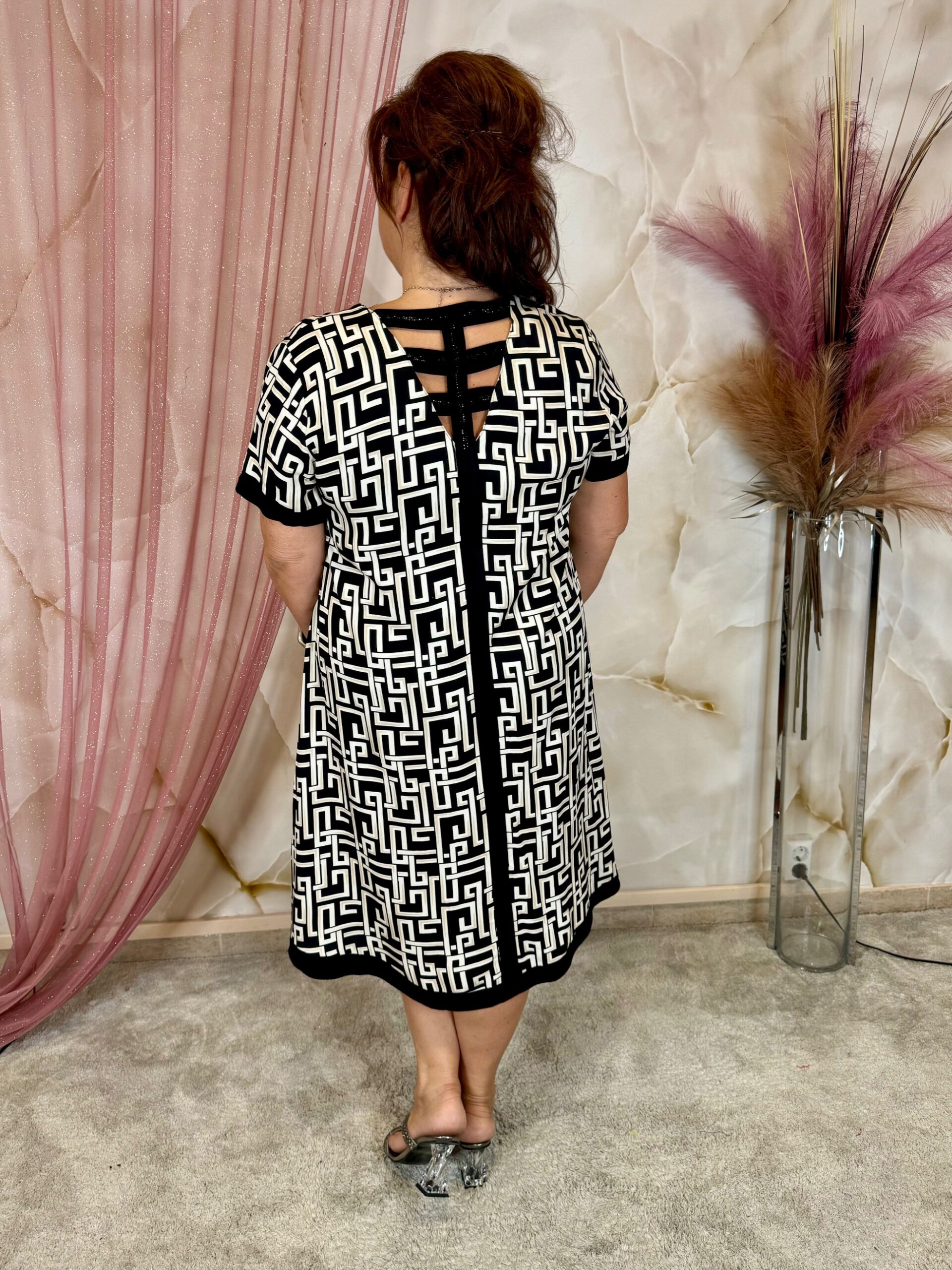 Bézs-fekete görög mintás pamutvászon ruha, prémium minőség, hátul keresztpántos