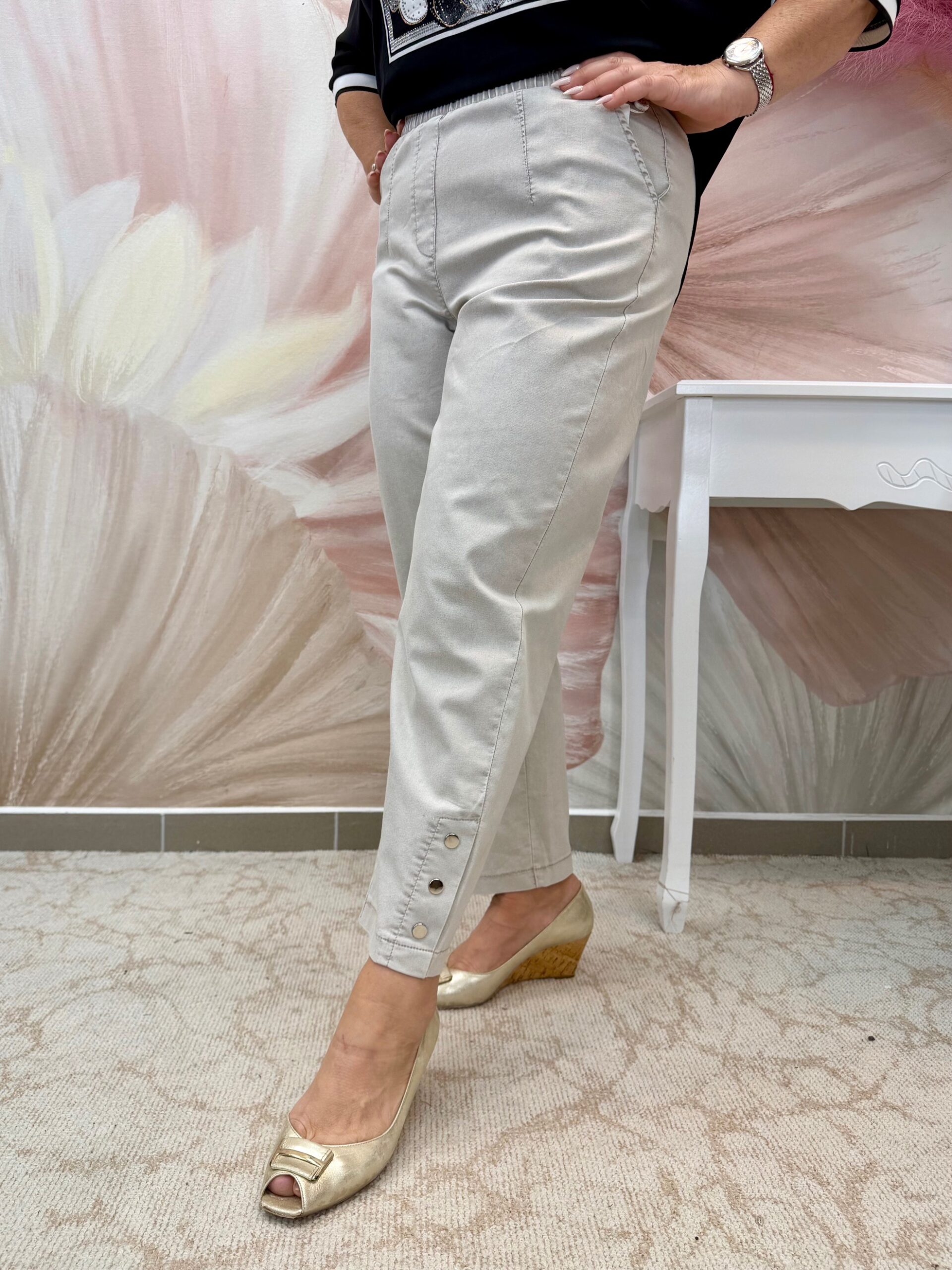 2026.03.19.Bézs gumis derekú nadrág bokáján patentokkal