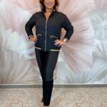 Elasztikus fekete nadrág fodros zsebbel, övvel