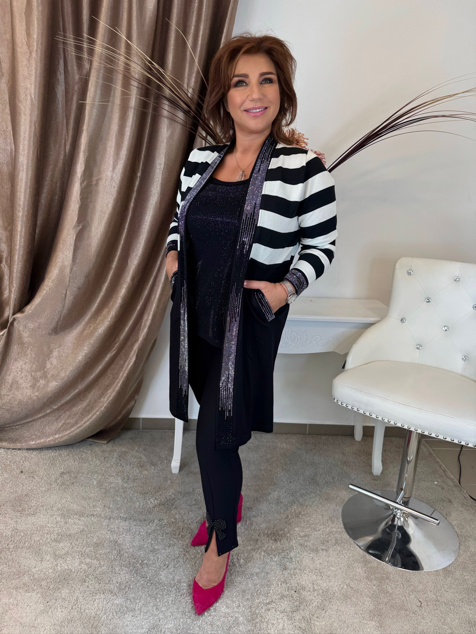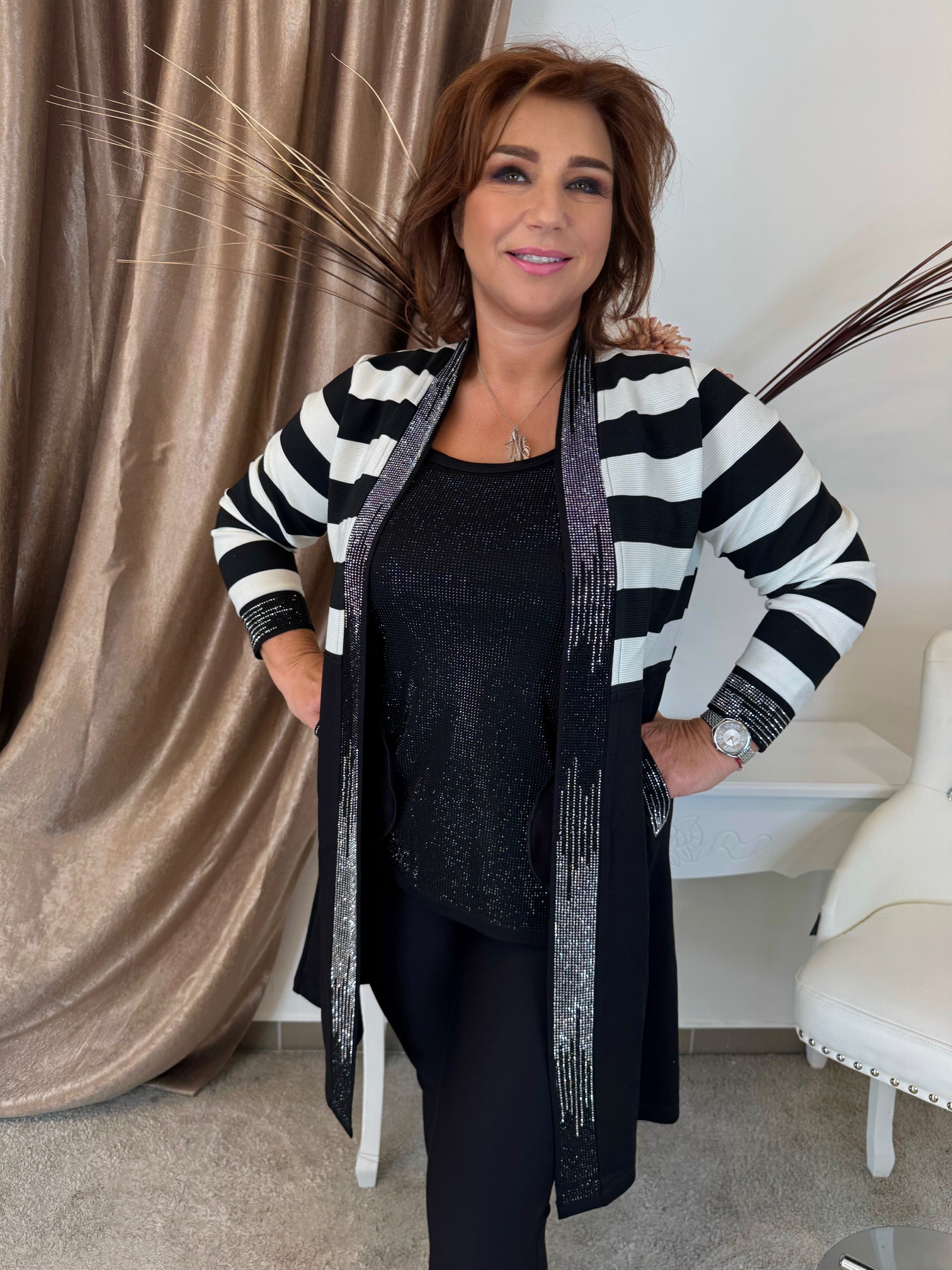 Csíkos hosszú kardigán kristályokkal elasztikus kötött anyagból