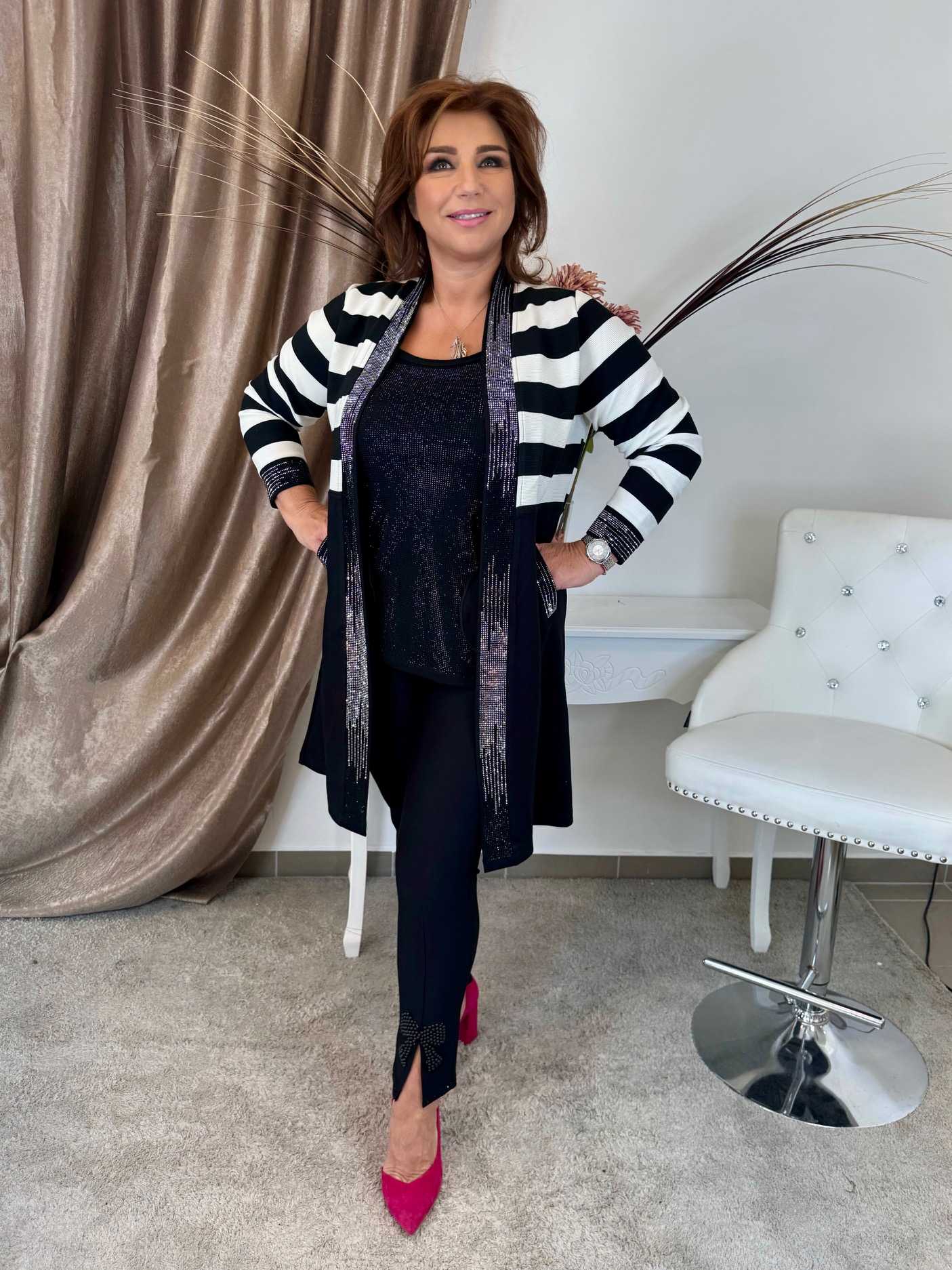 2025.03.16.Csíkos hosszú kardigán kristályokkal