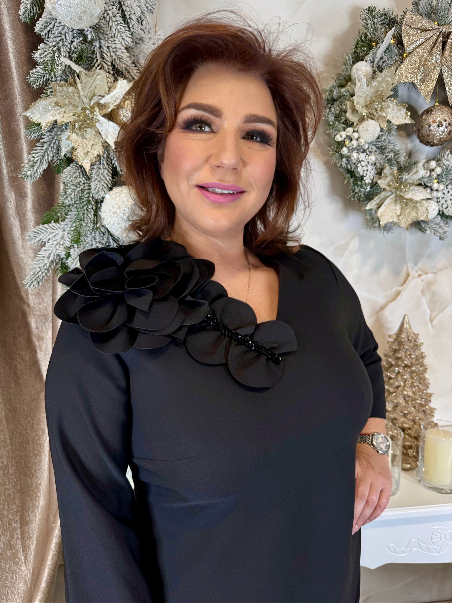 2024.12.08.Csinos alkalmi ruha vállán virágdísszel