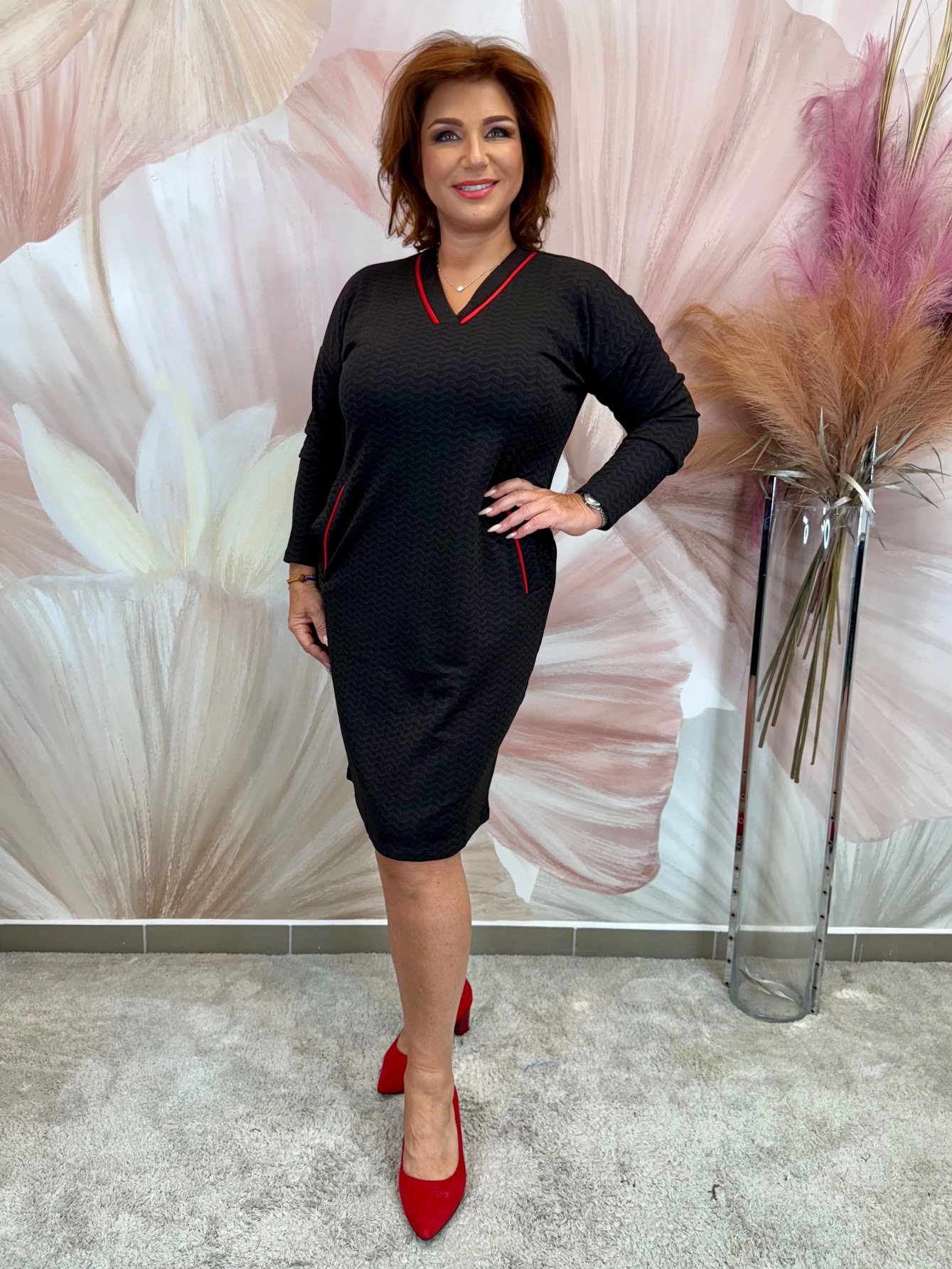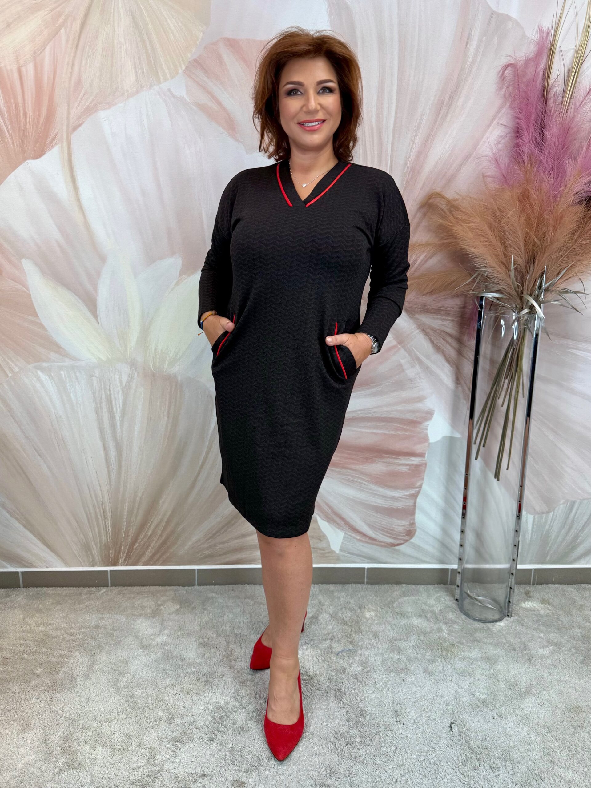 2025.09.18.Csinos anyagában mintás fekete ruha piros díszcsíkkal
