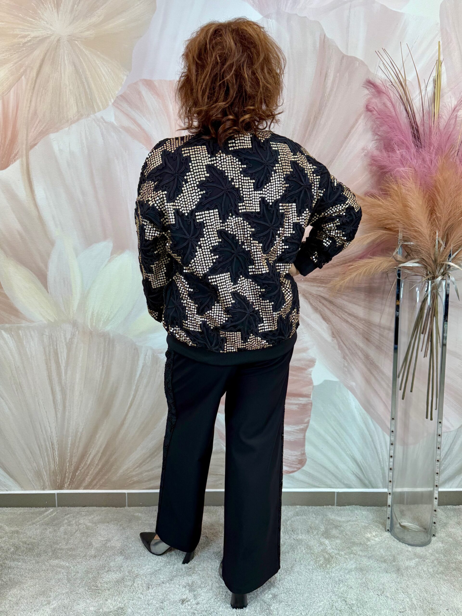Csinos arany fekete zippes felső, virágmintával, flitterekkel