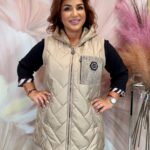 Hosszú pezsgőszínű mellény szőrmés kapucnival