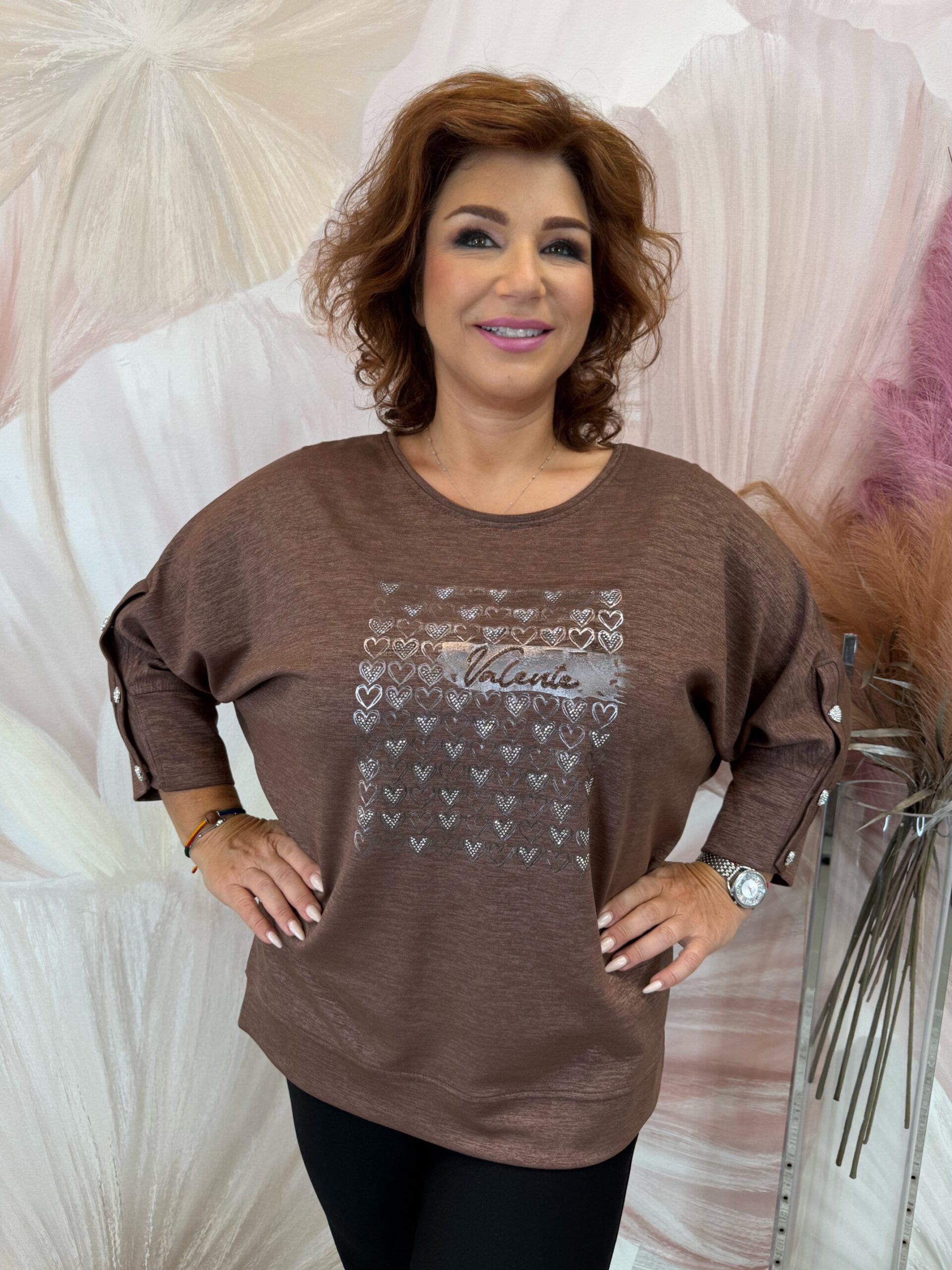 Csinos barna felső ezüst kristályokkal, ujján ezüst patentokkal, raglán ujjú
