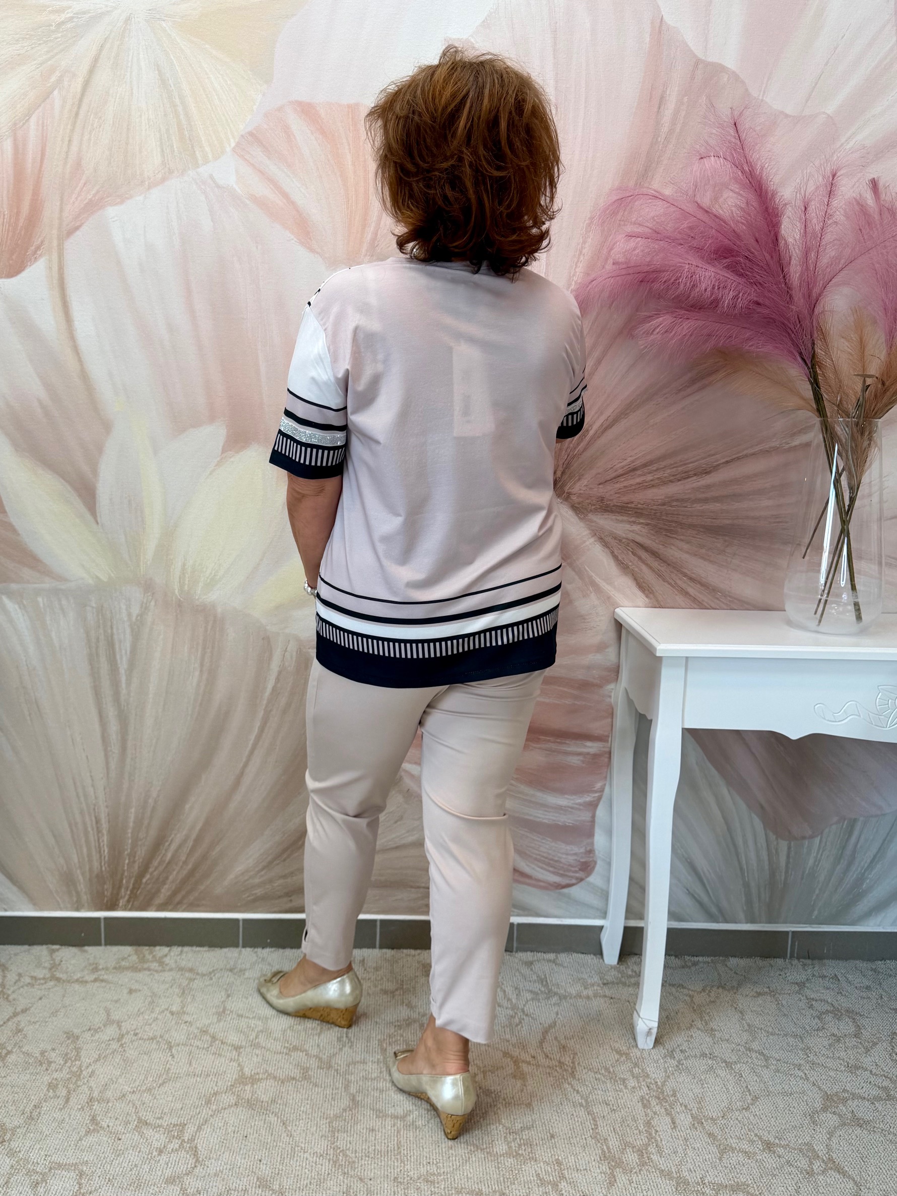 Csinos bézs felső ezüst és bézs kristályokkal, fekete mintákkal