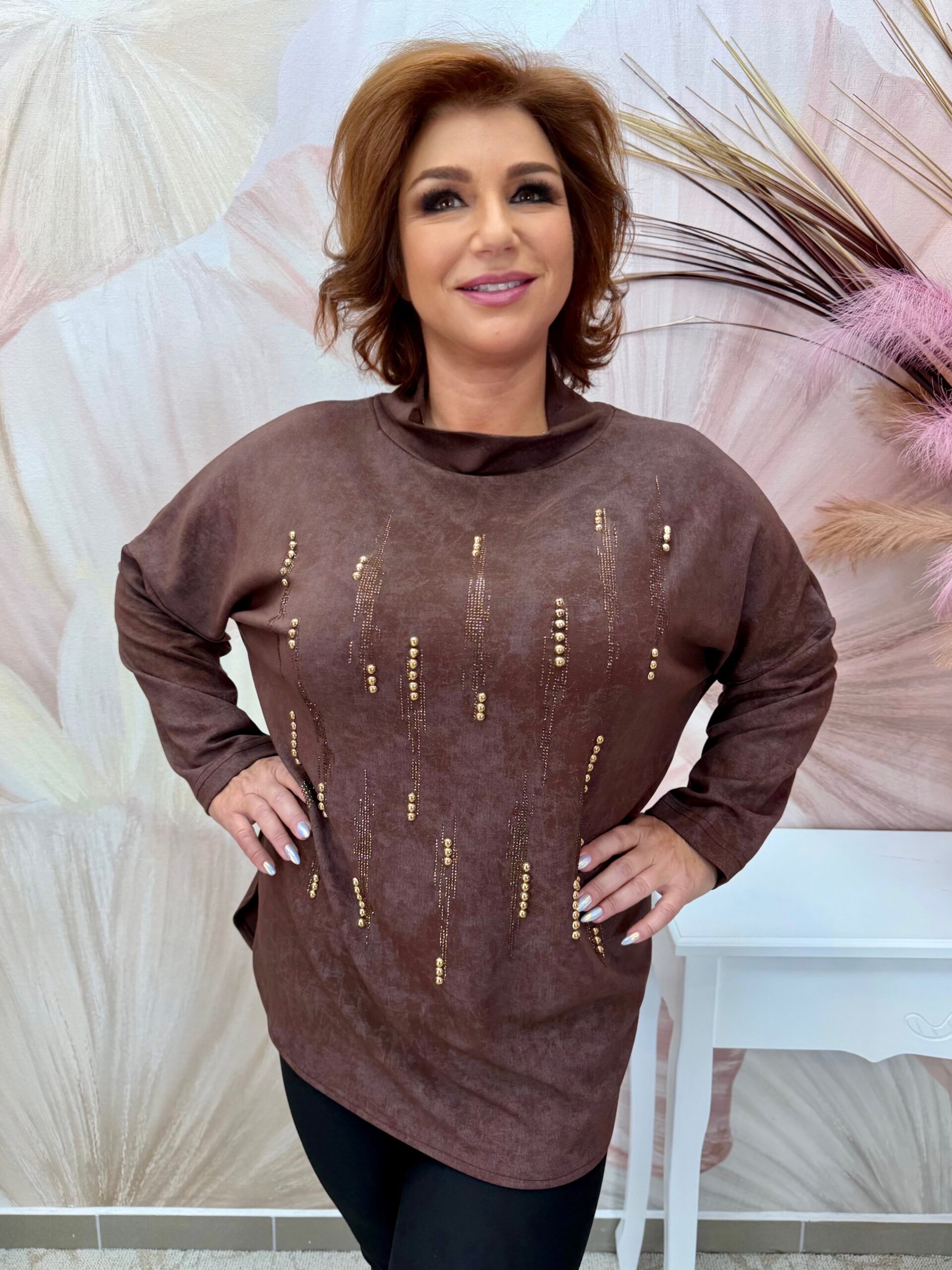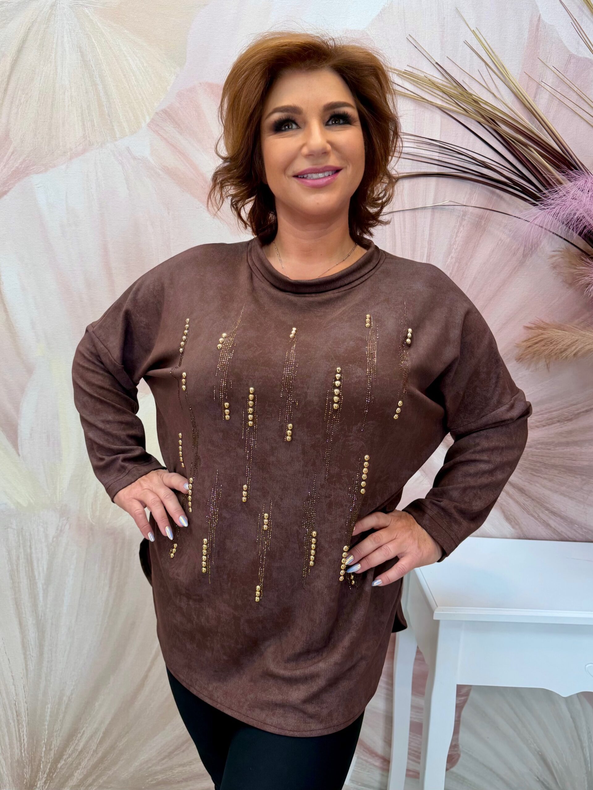 2025.11.06.Csinos csokibarna felső bronz gyöngypatentokkal
