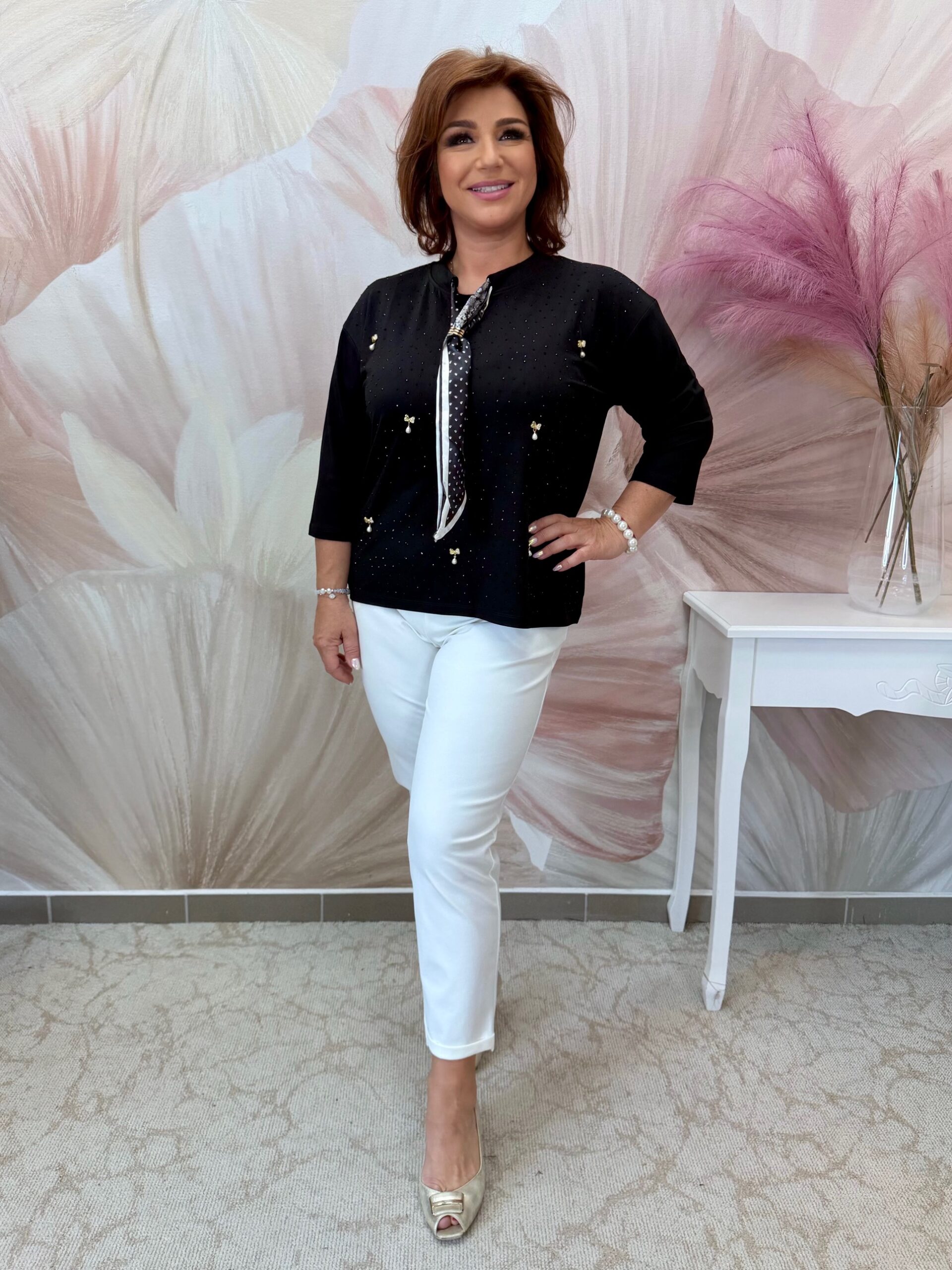 Fekete felső apró kristályokkal, selyemkendővel