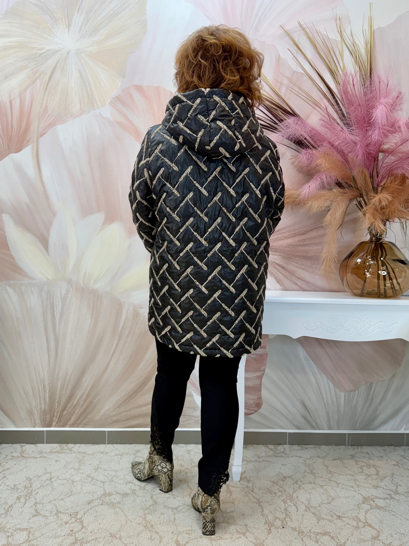 Fekete patentos anyagában mintás téli kabát szőrmével
