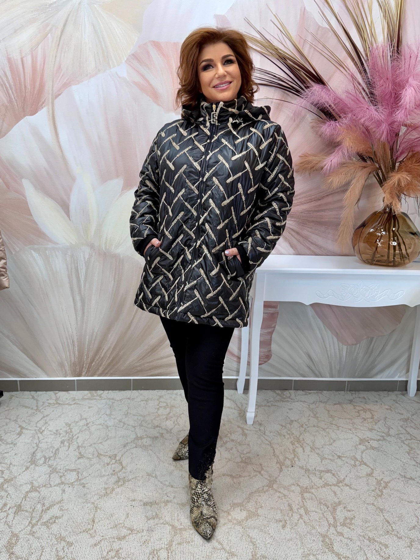 Csinos fekete zippes kiskabát virágmintákkal, flitterekkel