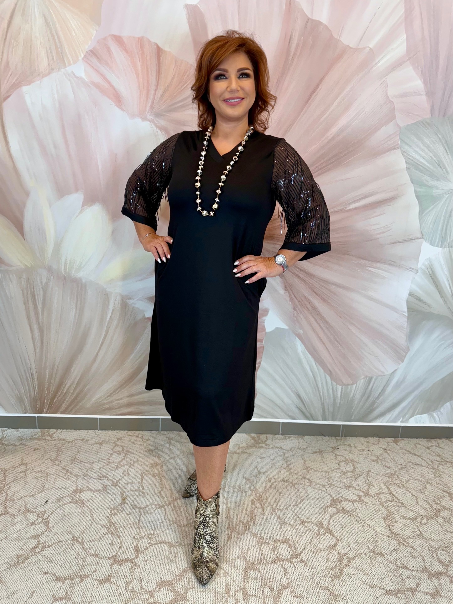 Csinos fekete pamut ruha tüllös flitteres ujjal