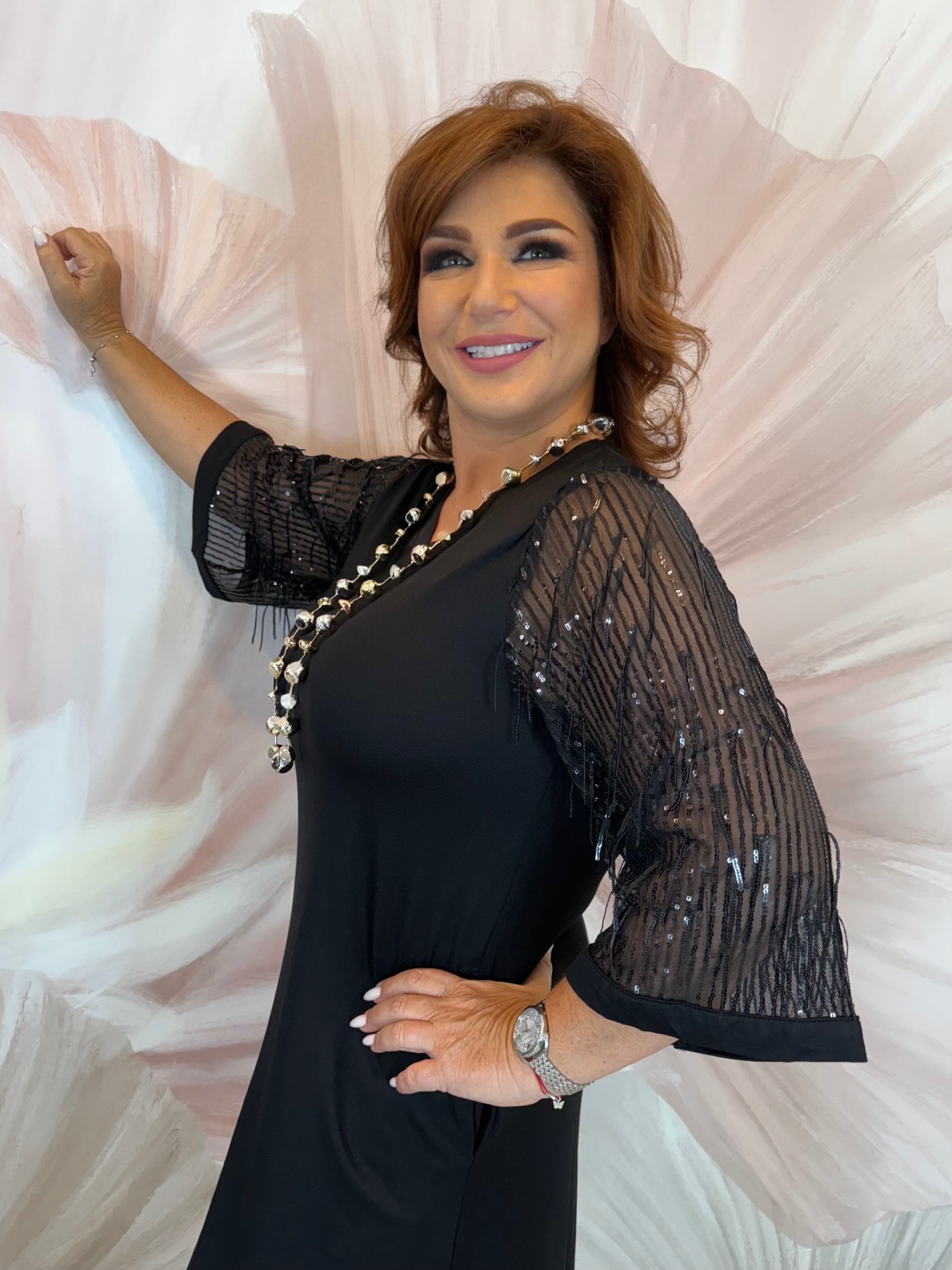 2025.10.02.Csinos fekete pamut ruha tüllös flitteres ujjal