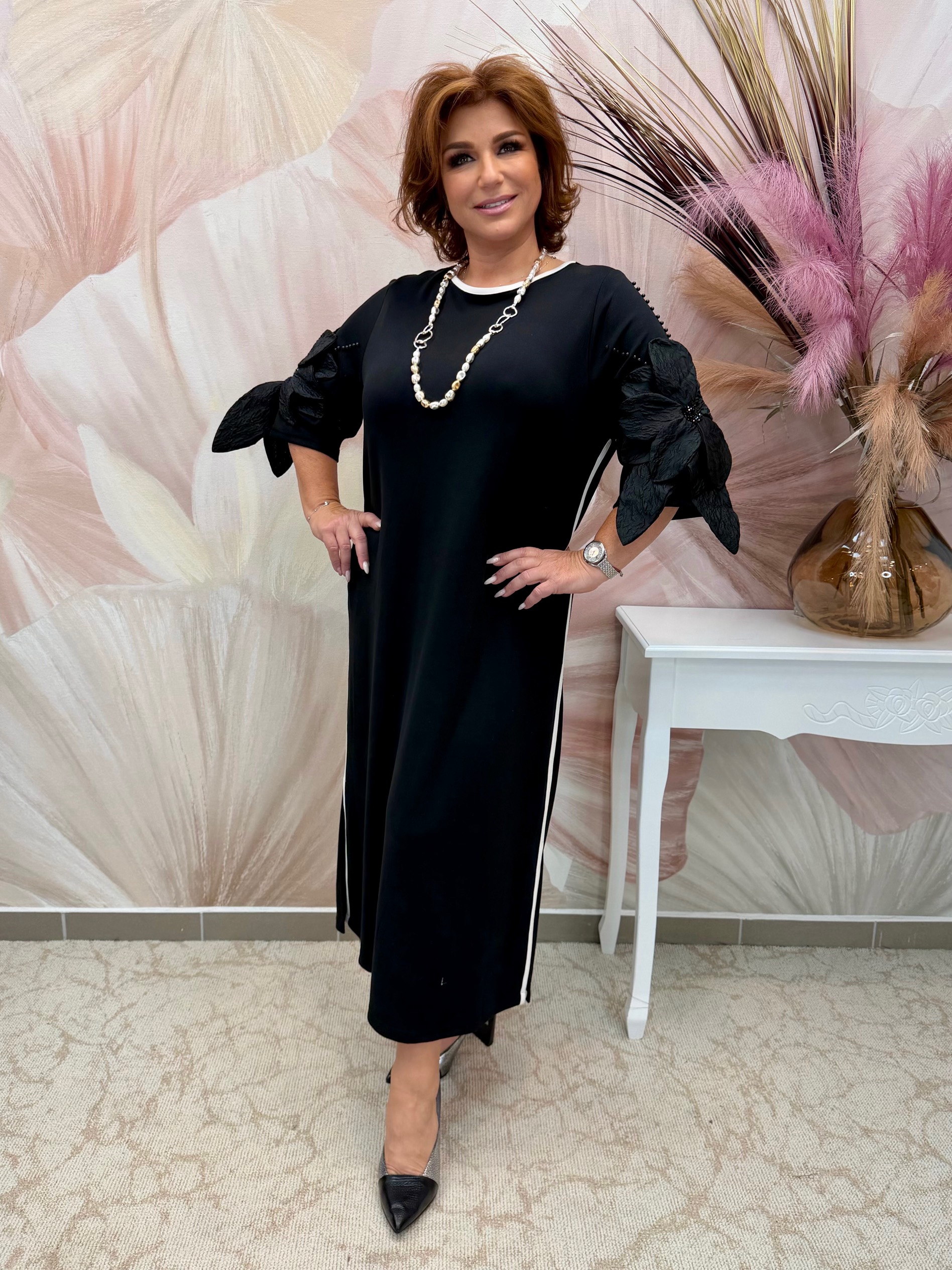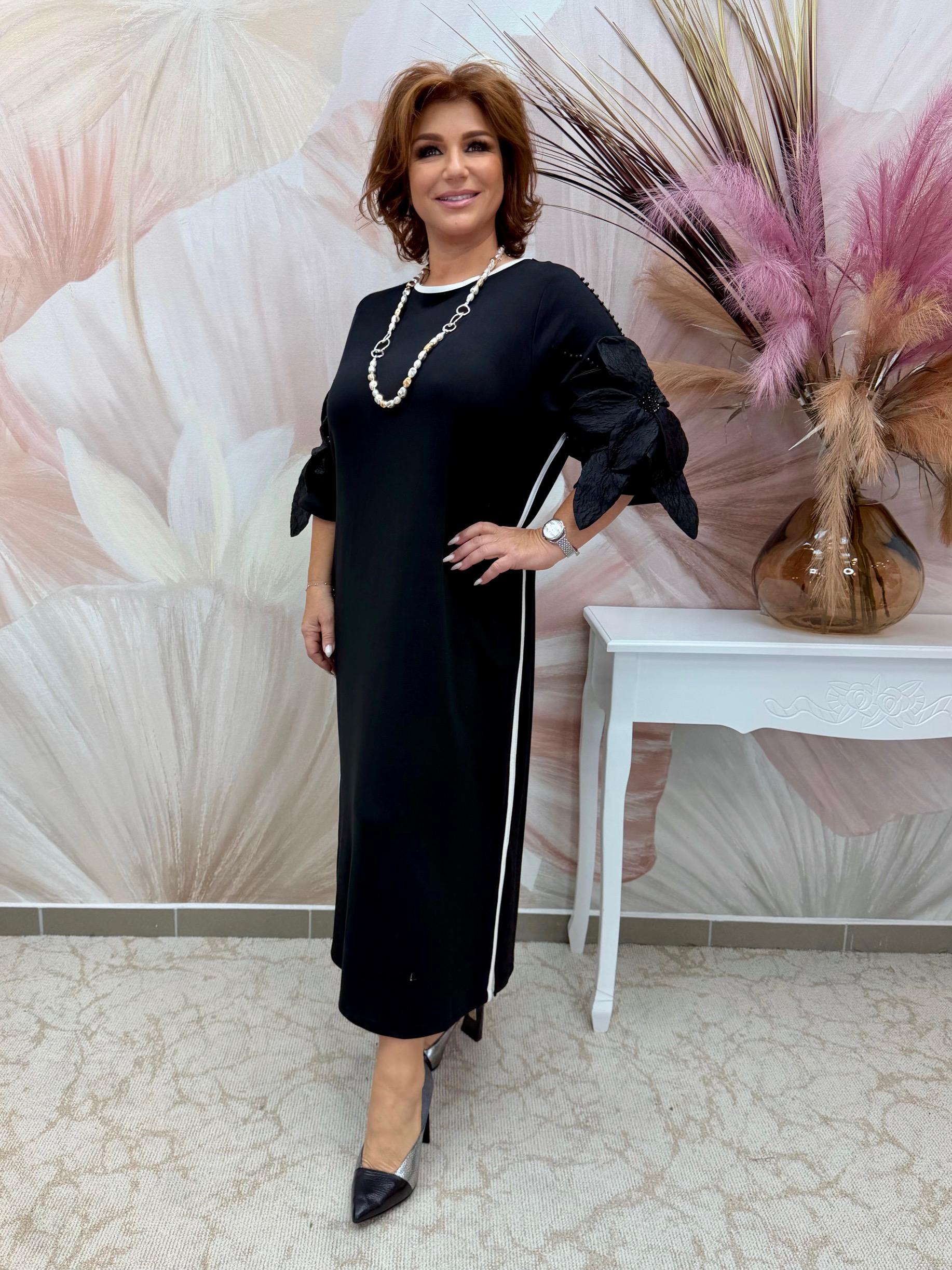 2025.10.30.Csinos fekete ruha ujján virágdísszel