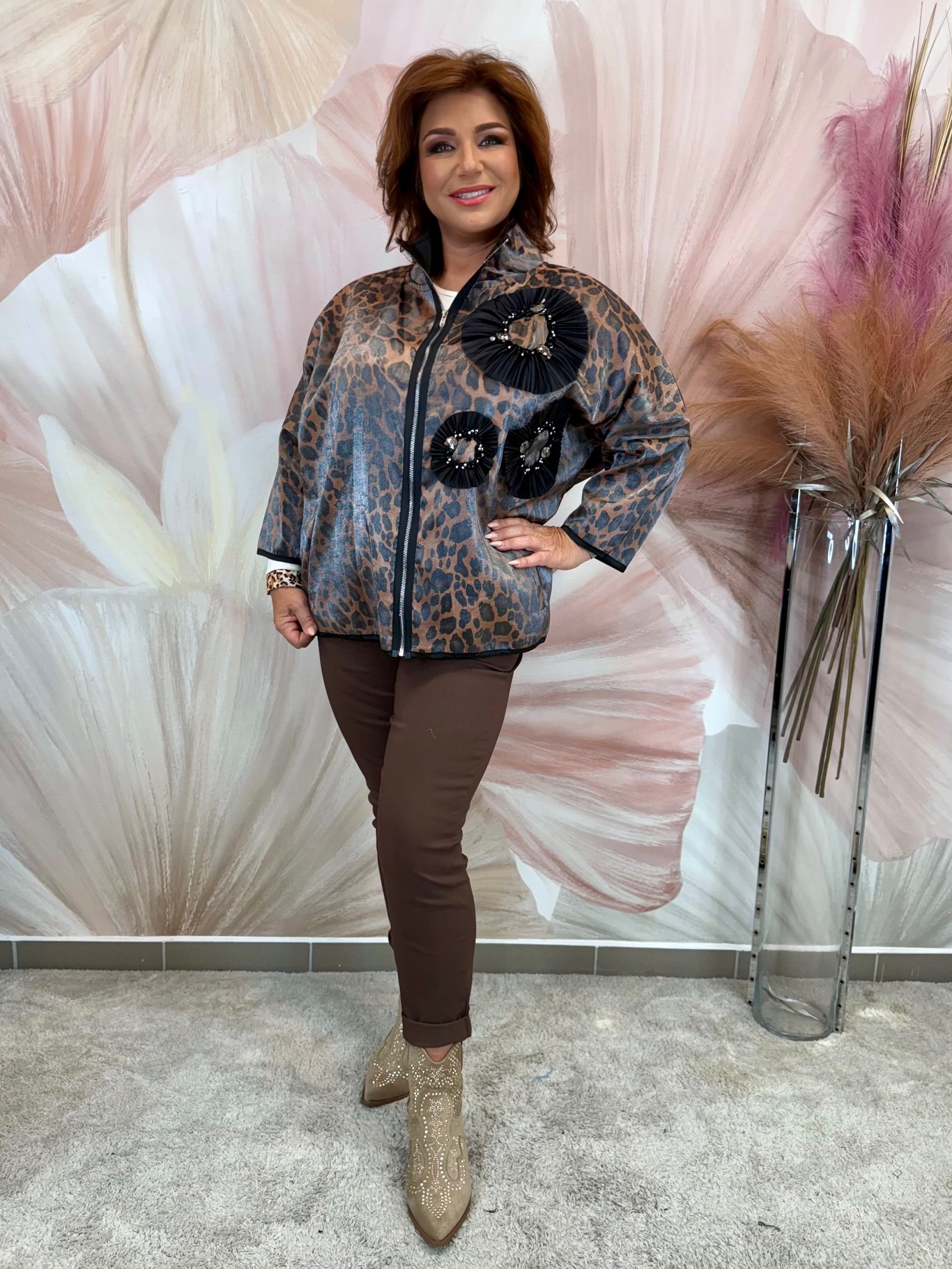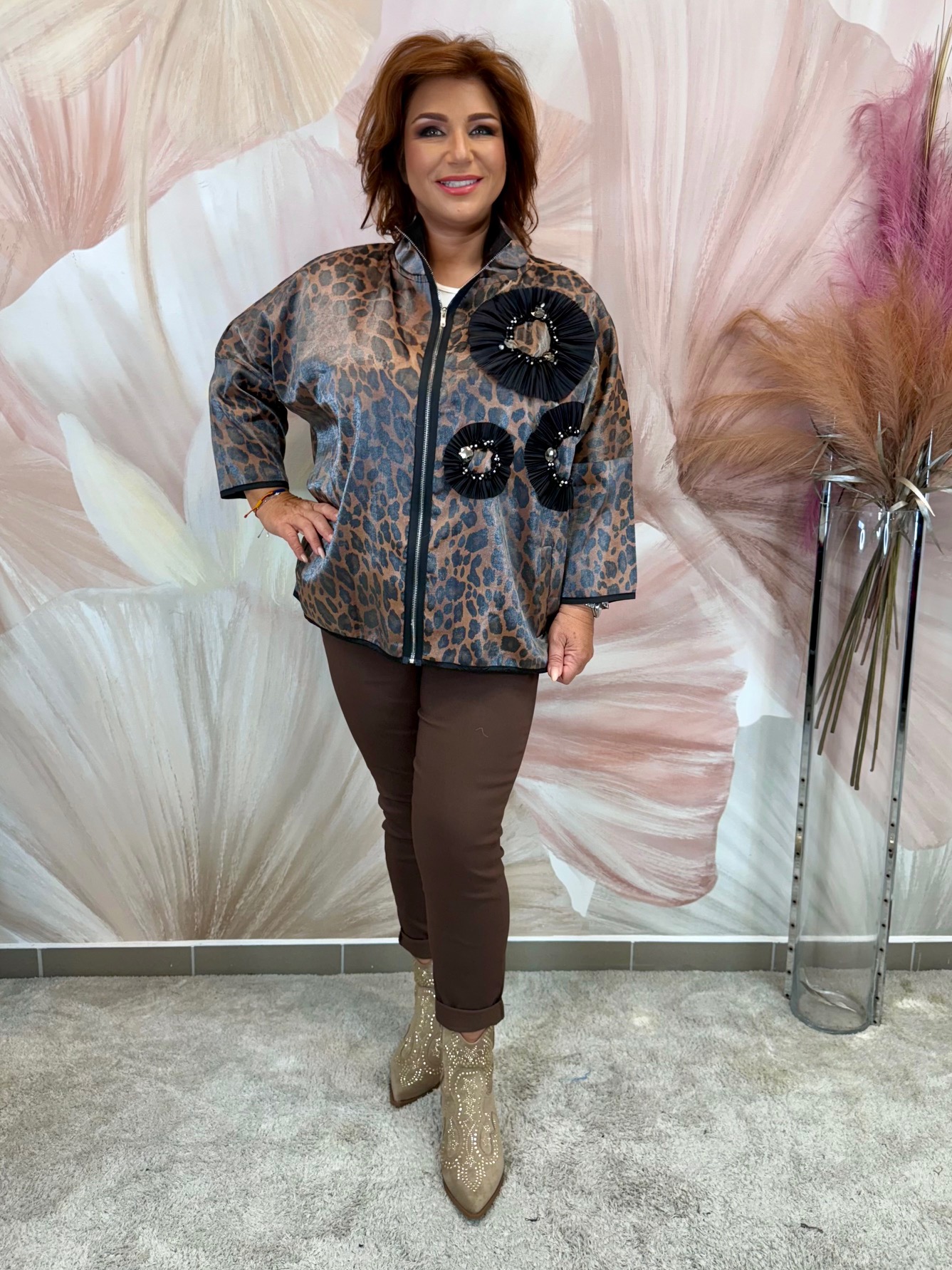 Csinos fényes anyagú ocelotmintás dzseki