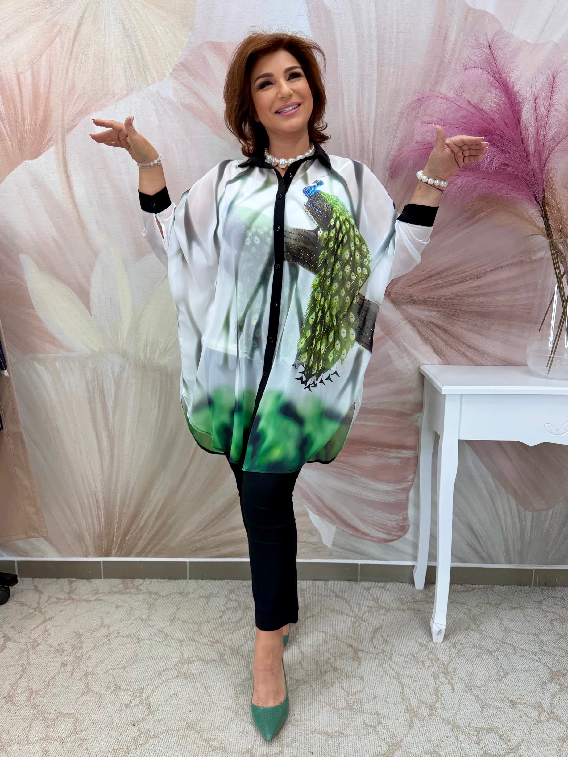 Csinos gombos páva mintás muszlin tunika toppal
