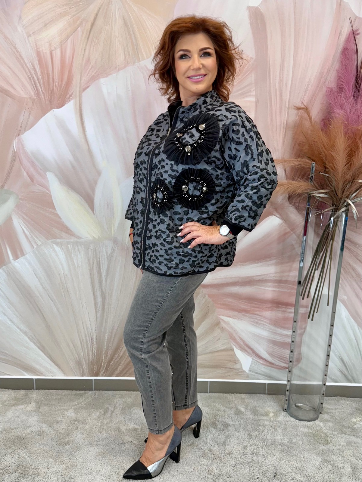 Csinos gyűrt anyagú ocelotmintás dzseki