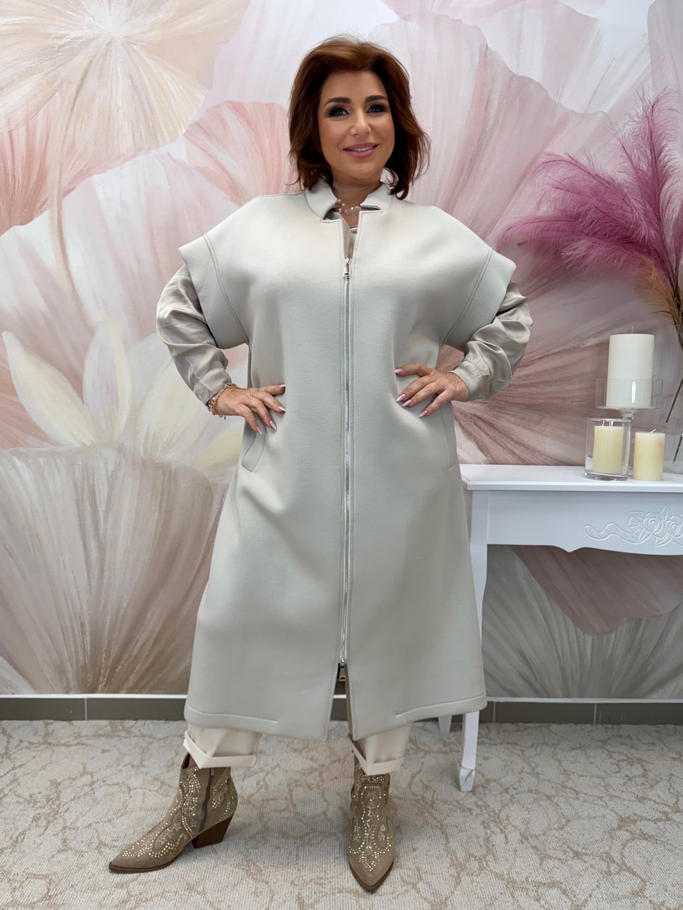 2026.02.19.Csinos hosszú bézs rövidujjú kabát