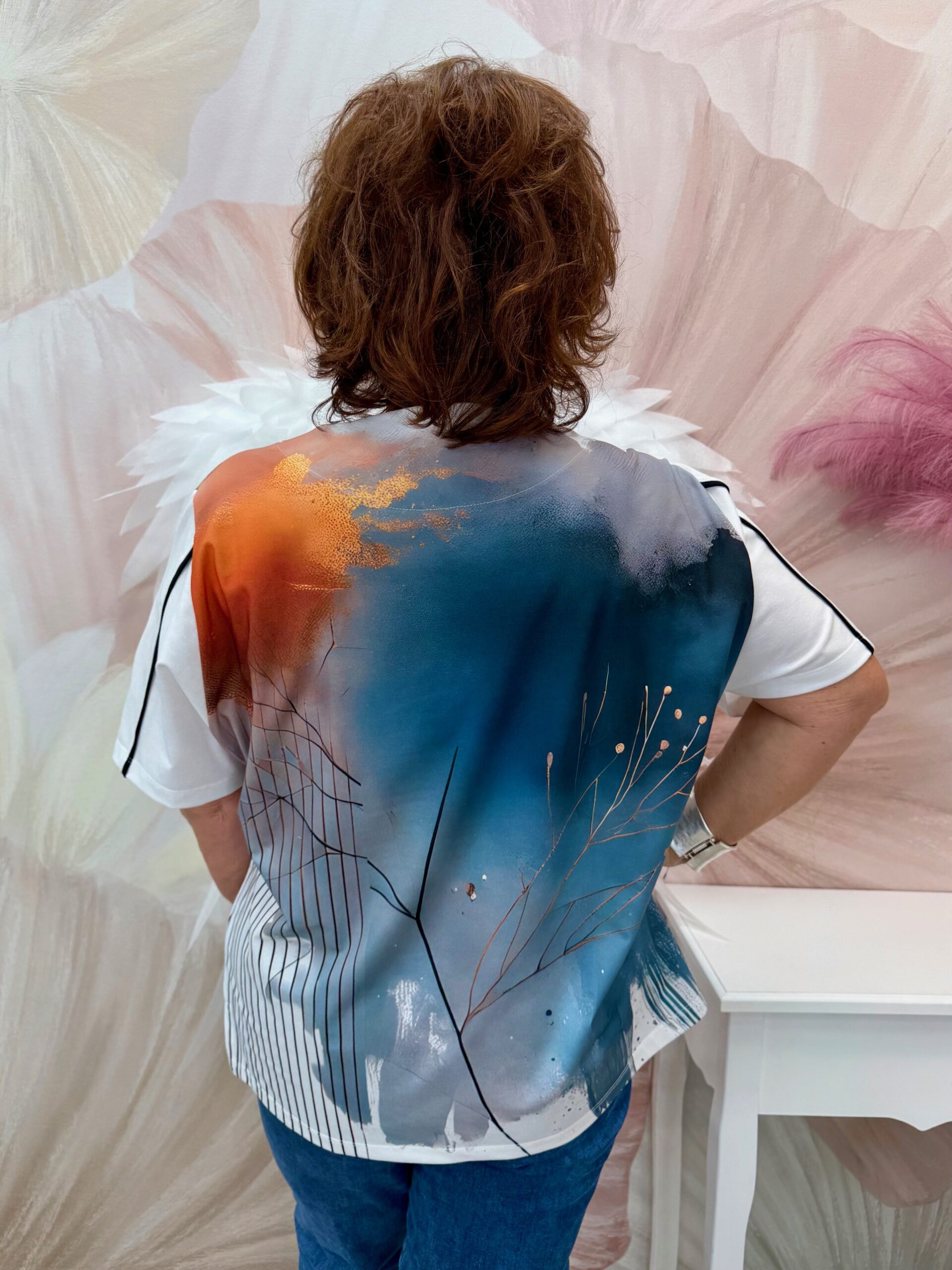 Sötétkék csíkos felső színes mintával, kristályokkal