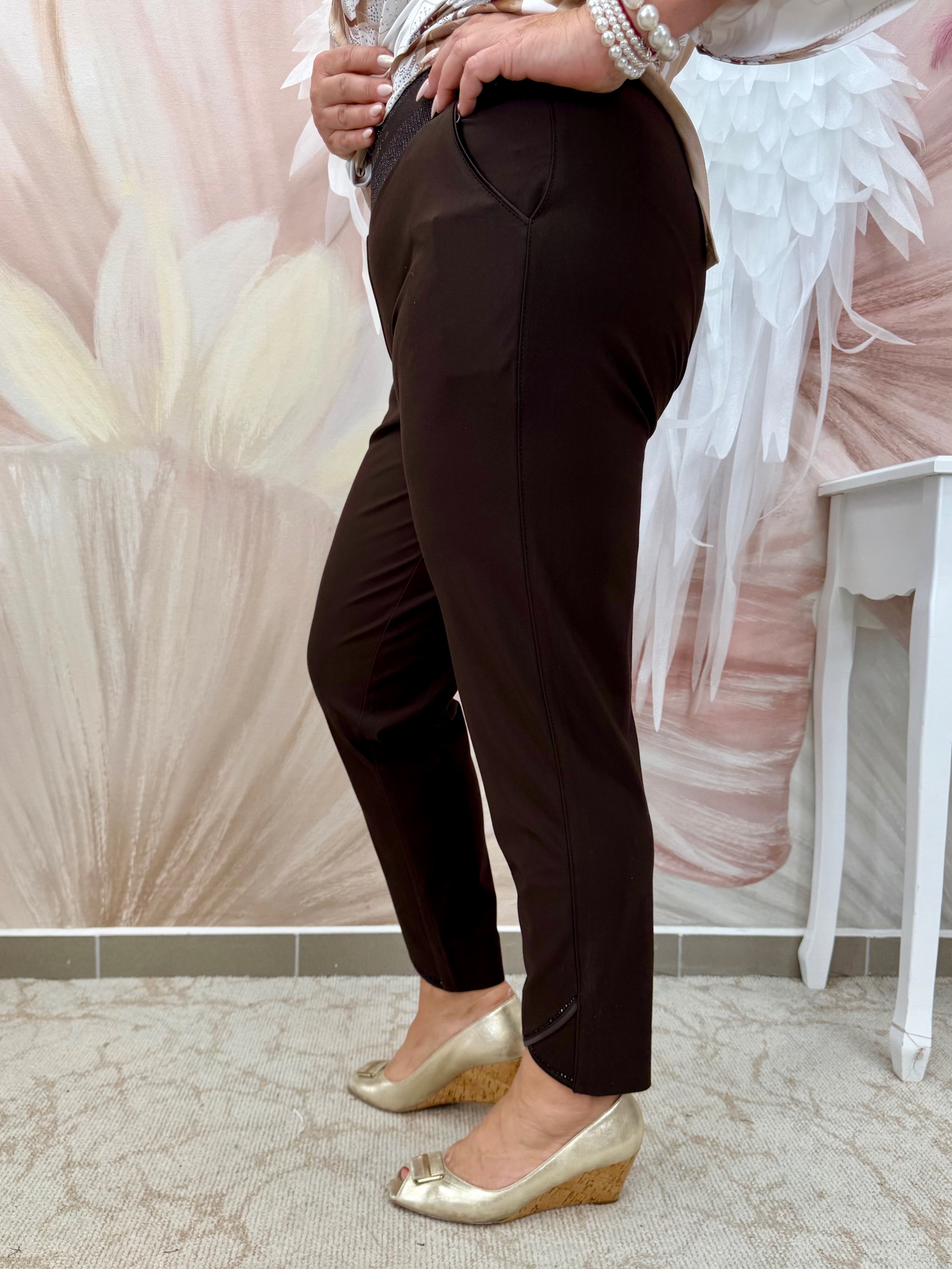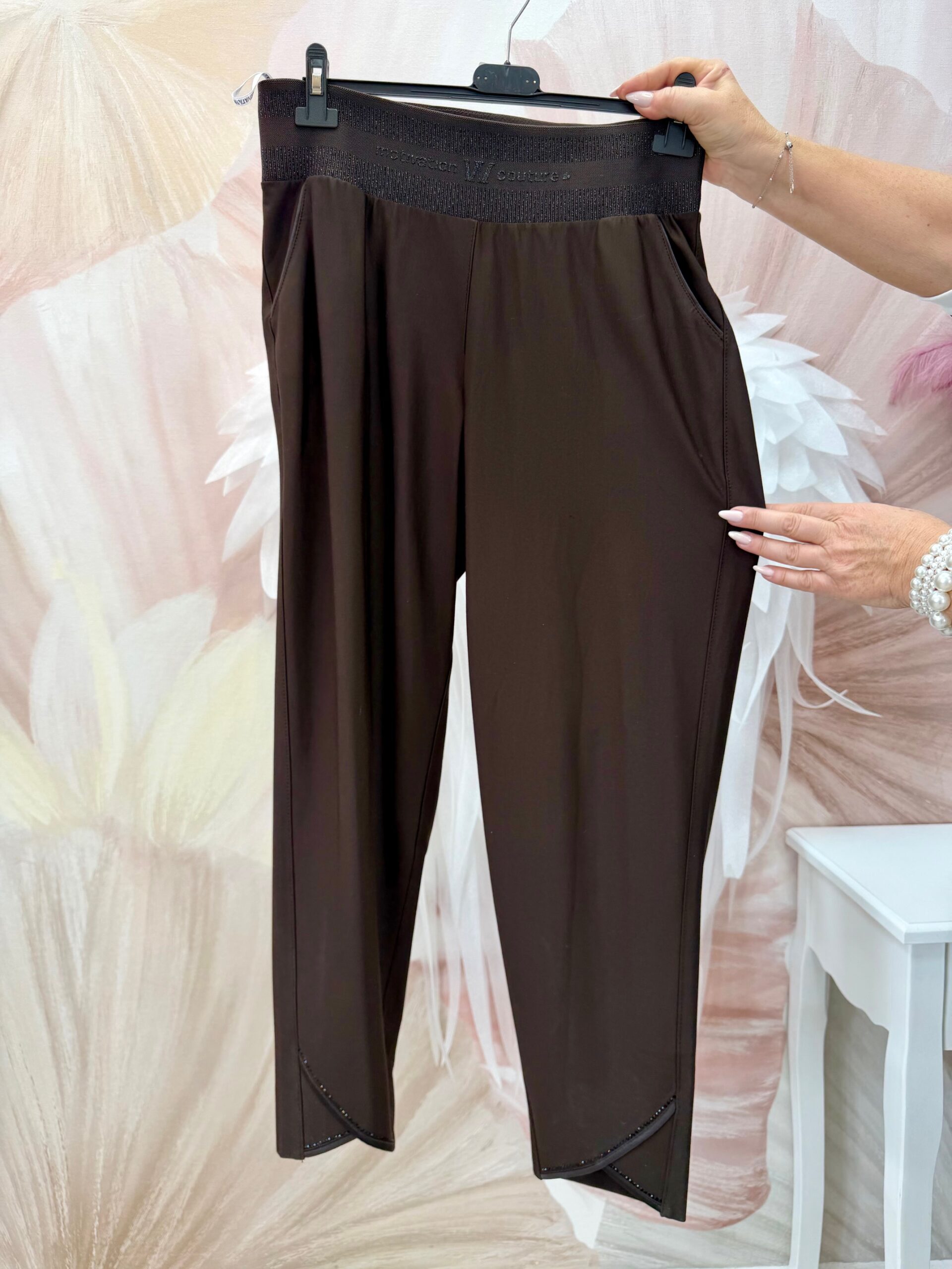 Csokibarna elasztikus nadrág bokáján kristályokkal