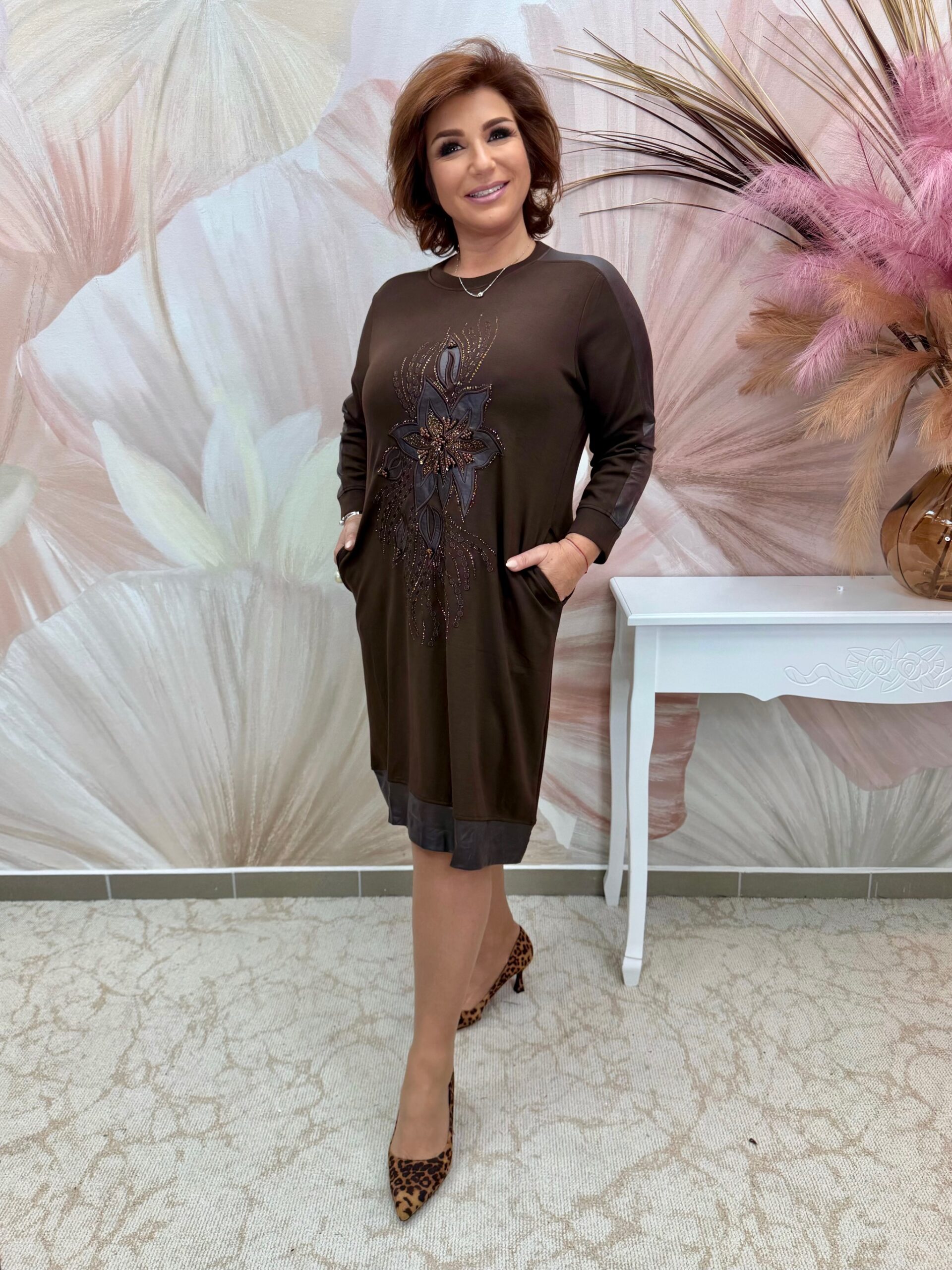 Barna pamut ruha bőrbetéttel, kristályvirággal