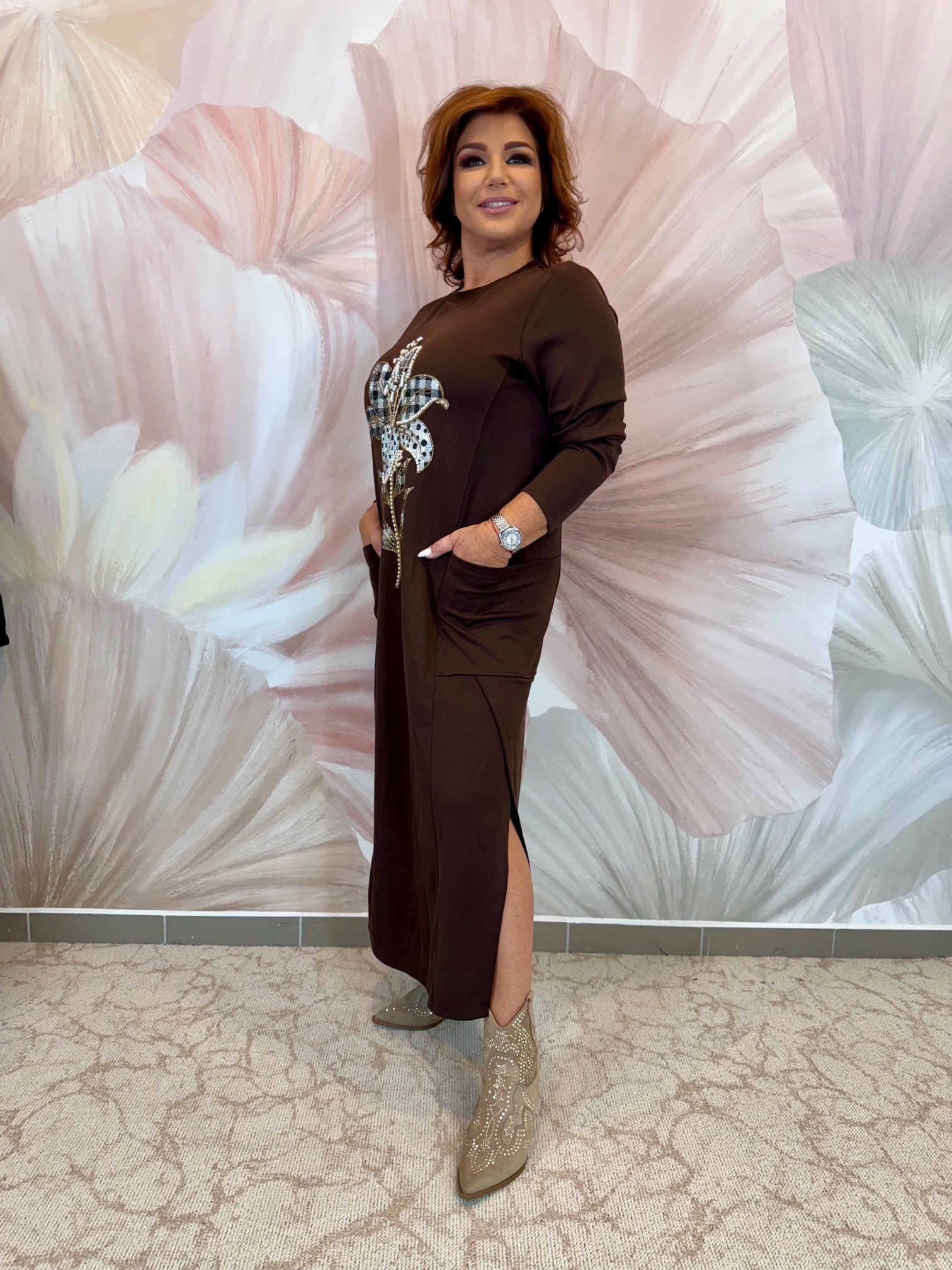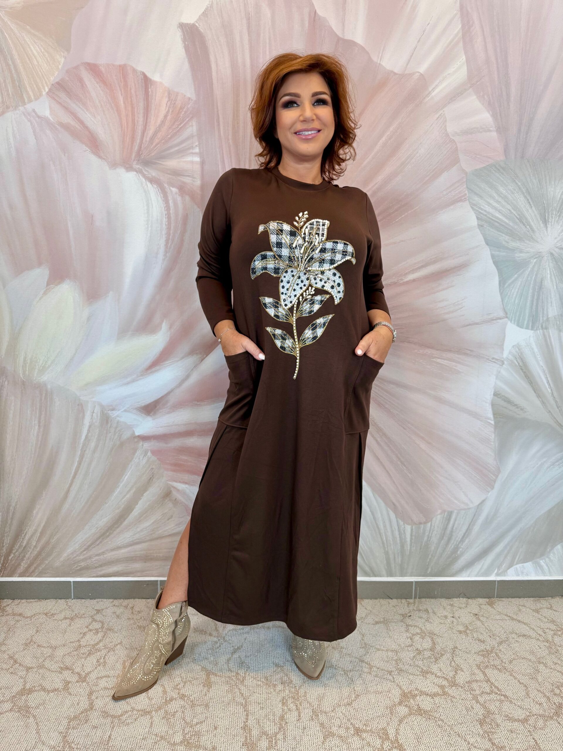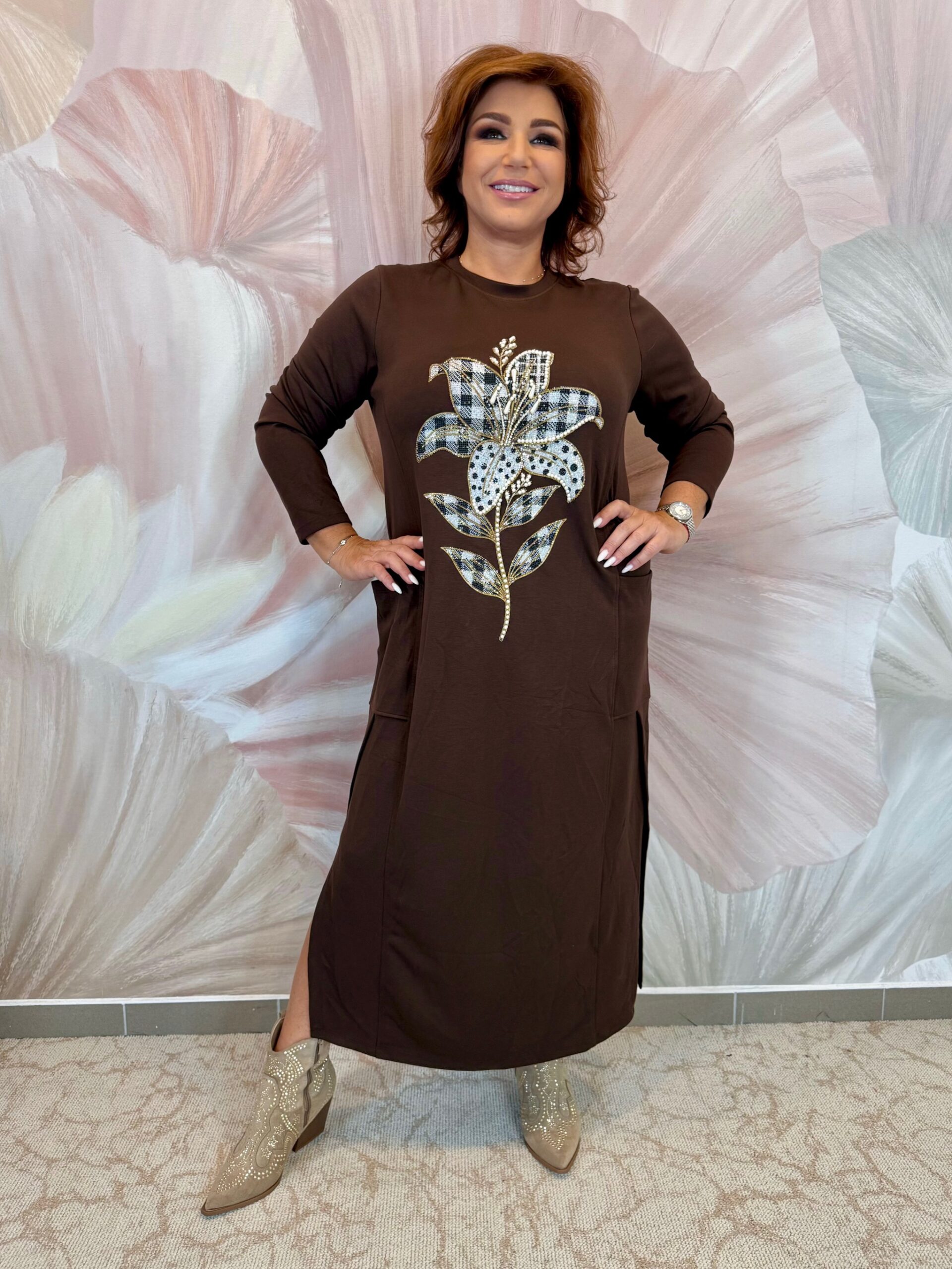 2025.09.25.Csokibarna pamut ruha virágmintával, strasszokkal