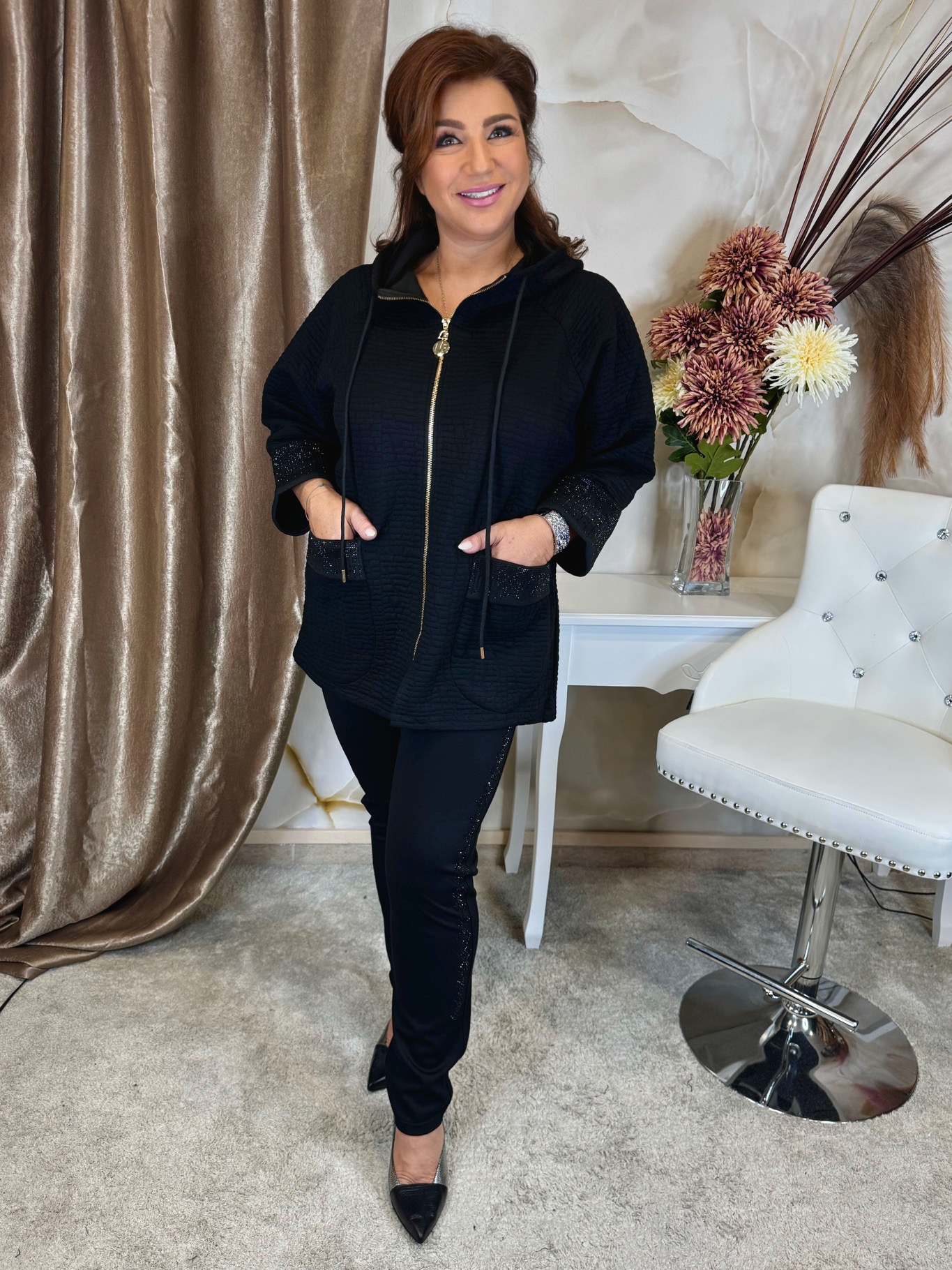 Elasztikus fekete kiskabát, végig zippes, bordázott anyag, kristályokkal