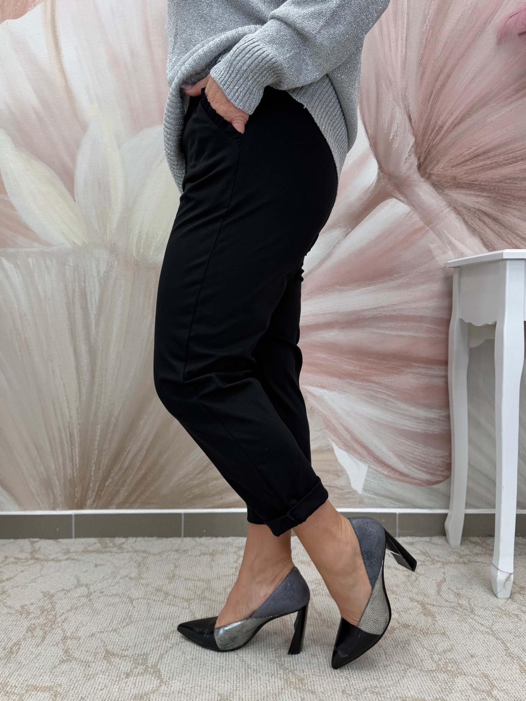 Elasztikus fekete nadrág fodros zsebbel, övvel