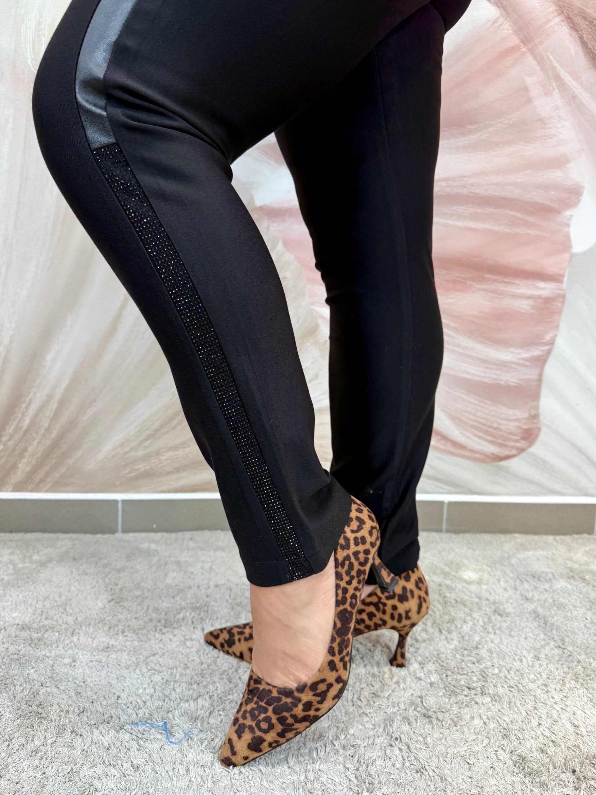 Elasztikus fekete nadrág oldalán bőr és kristálykőcsíkkal