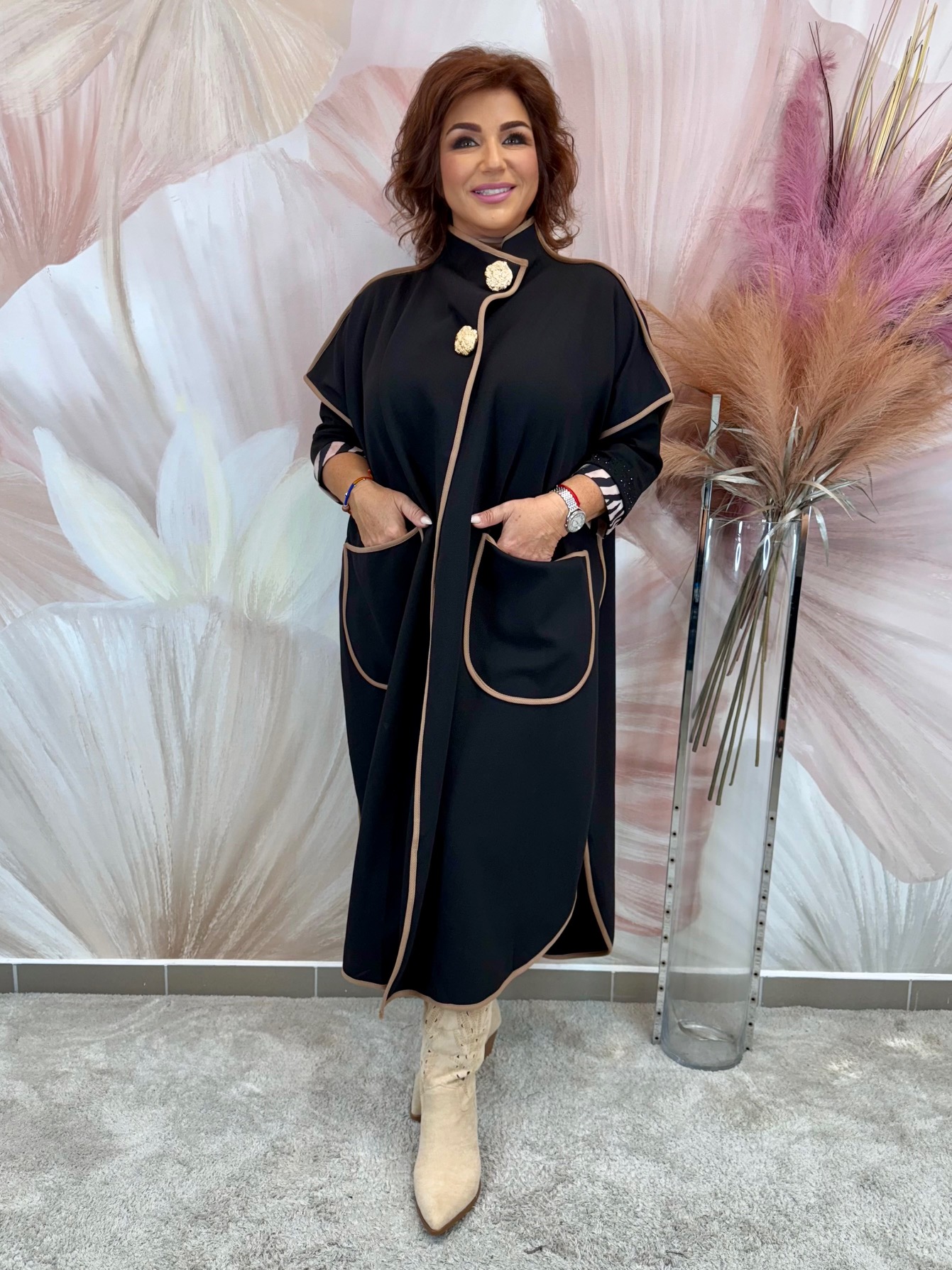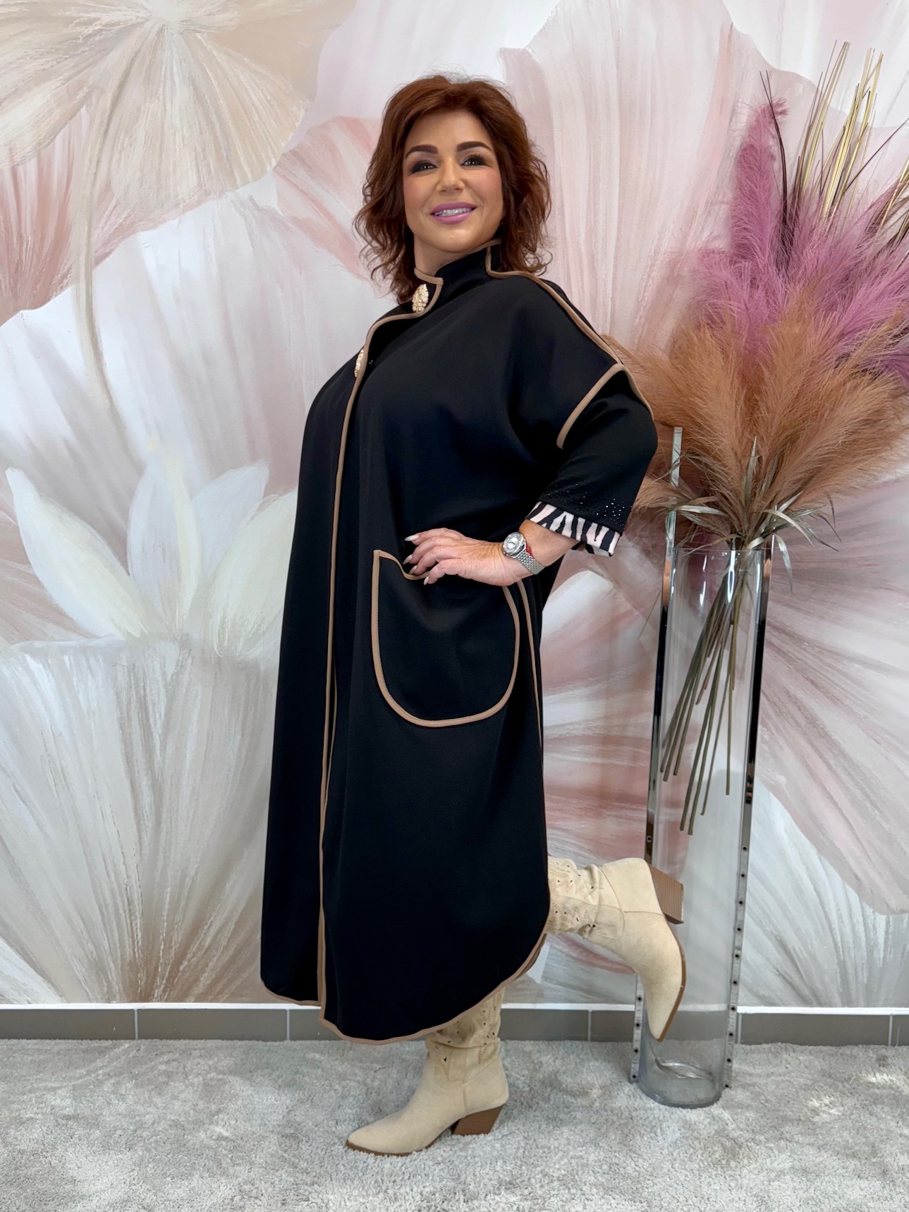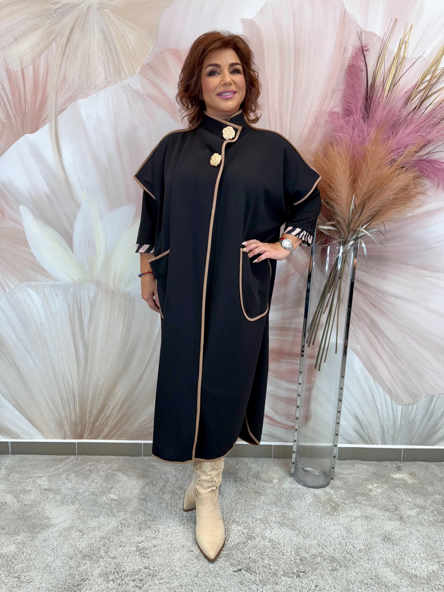 Elegáns hosszú barna-fekete prémium szövetkabát