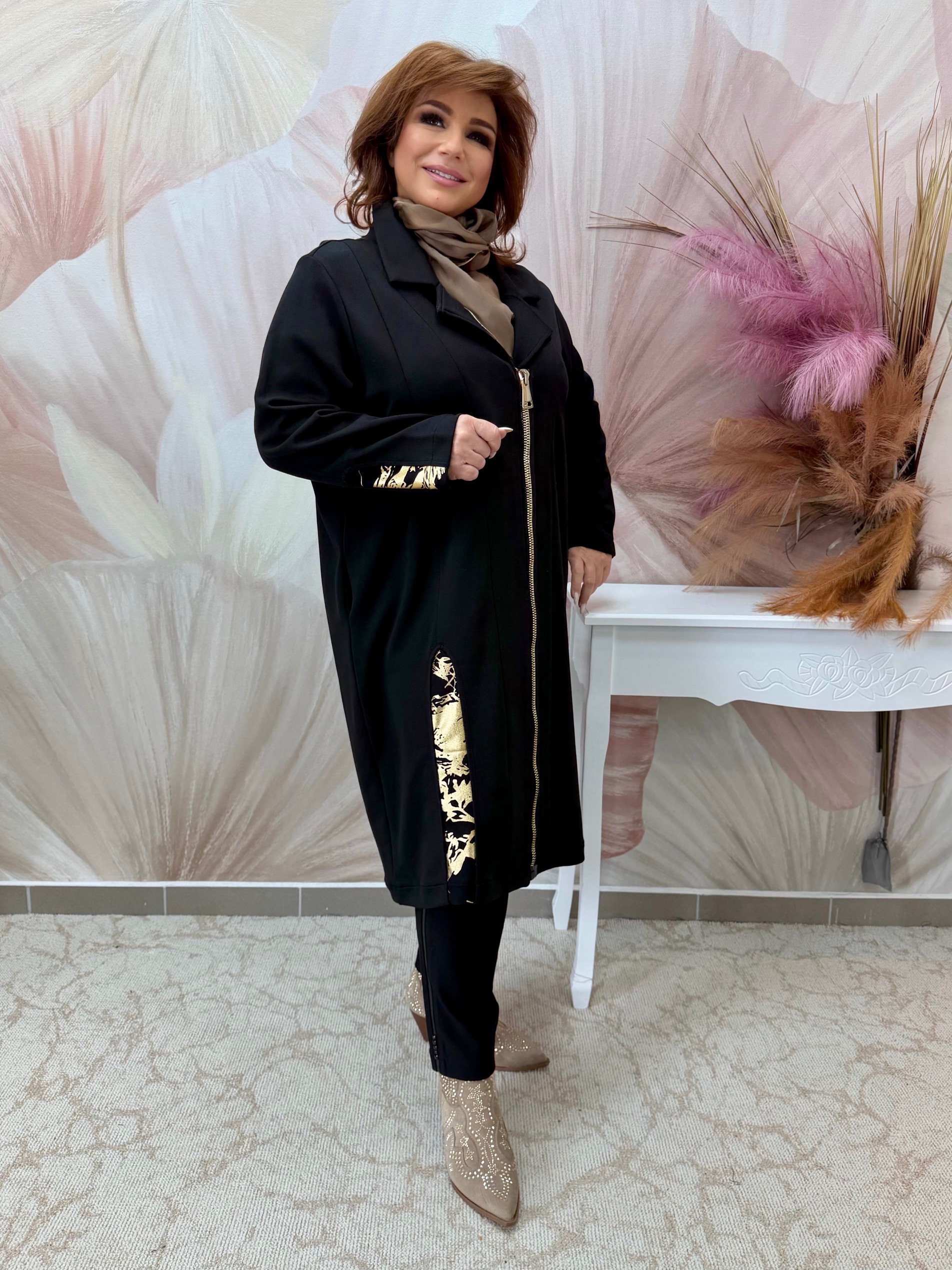 Elegáns hosszú fekete-arany pamut kabát