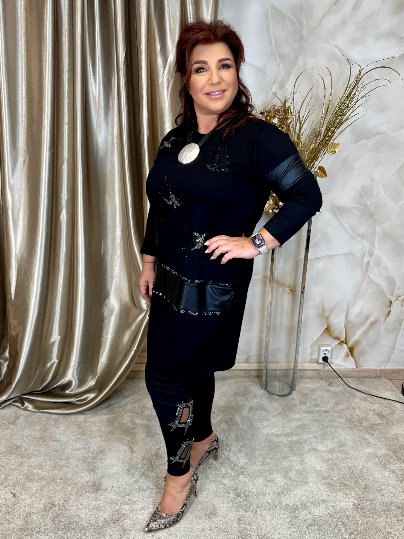 Fecskés ruha bőrbetéttel és kristályokkal, elasztikus pamut