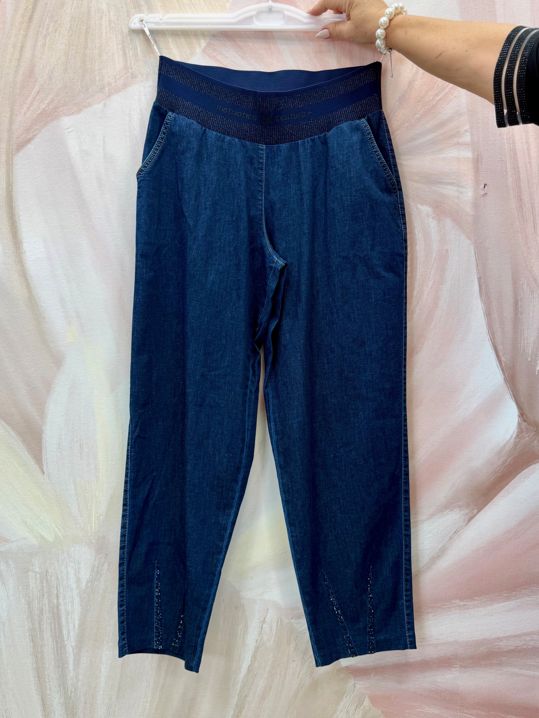 Sötét gumis derekú farmernadrág bokáján kristályokkal