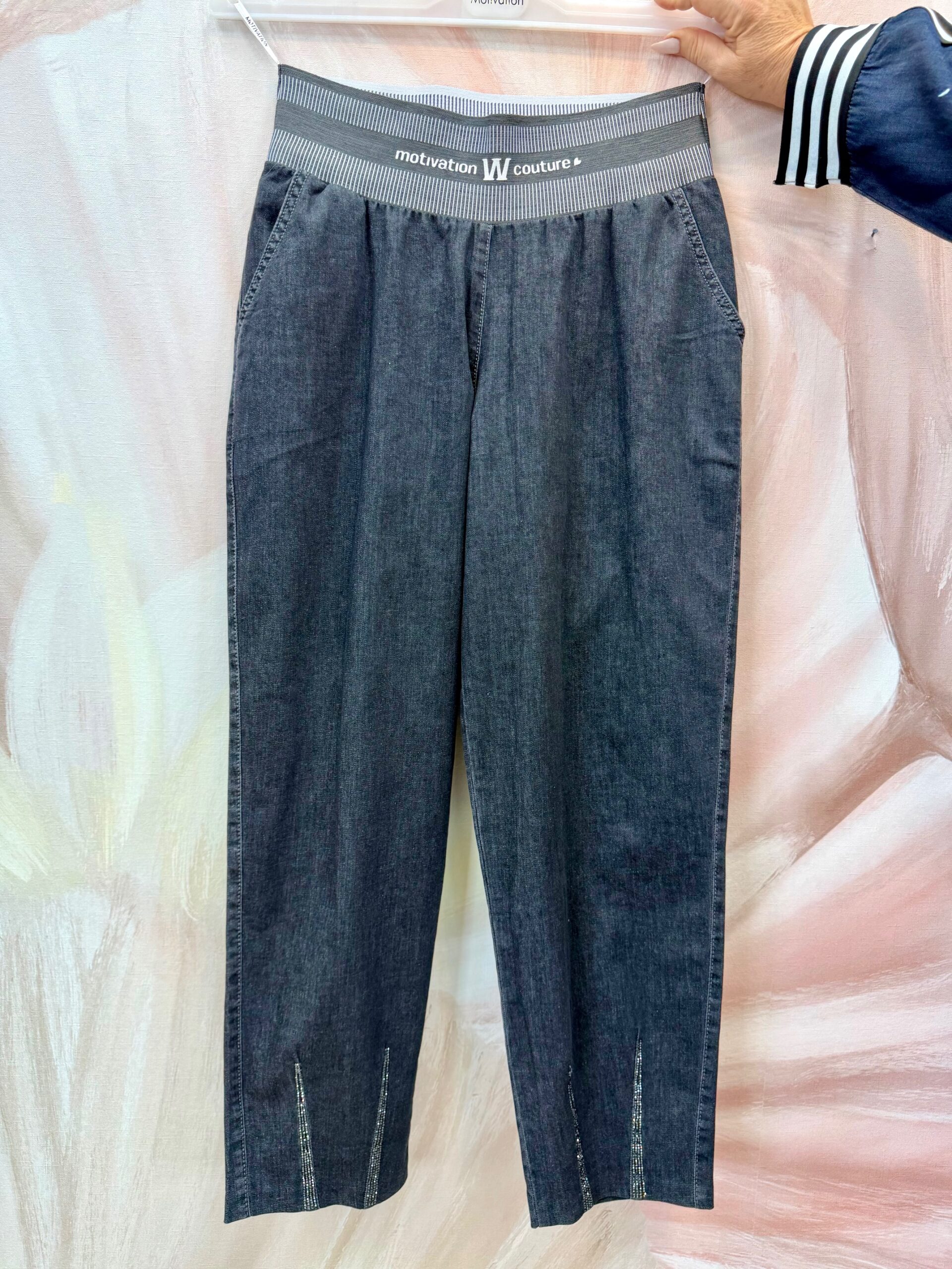 Szürke gumis derekú farmernadrág bokáján kristályokkal