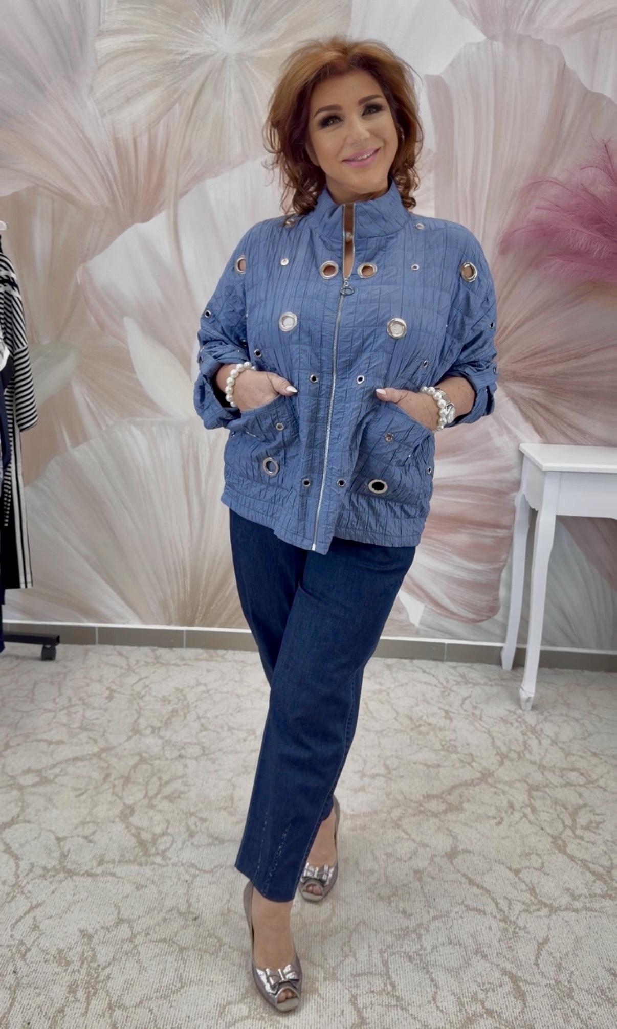 Pasztellkék gyűrt anyagú ezüst riglis dzseki