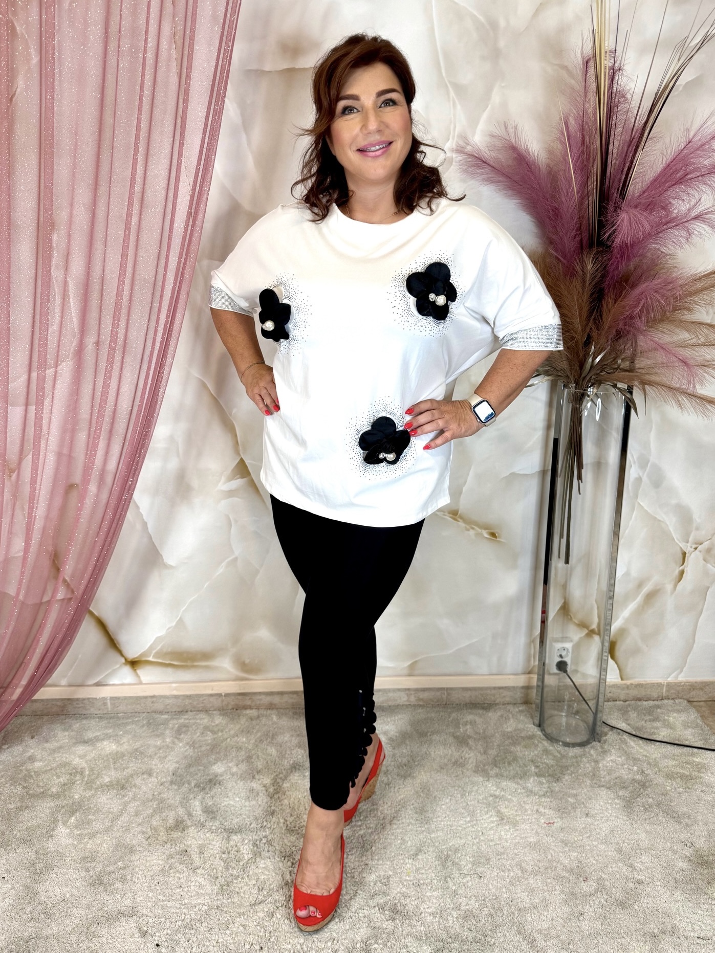 Fehér pamut felső fekete virágokkal, raglán ujjú. elasztikus prémium pamut