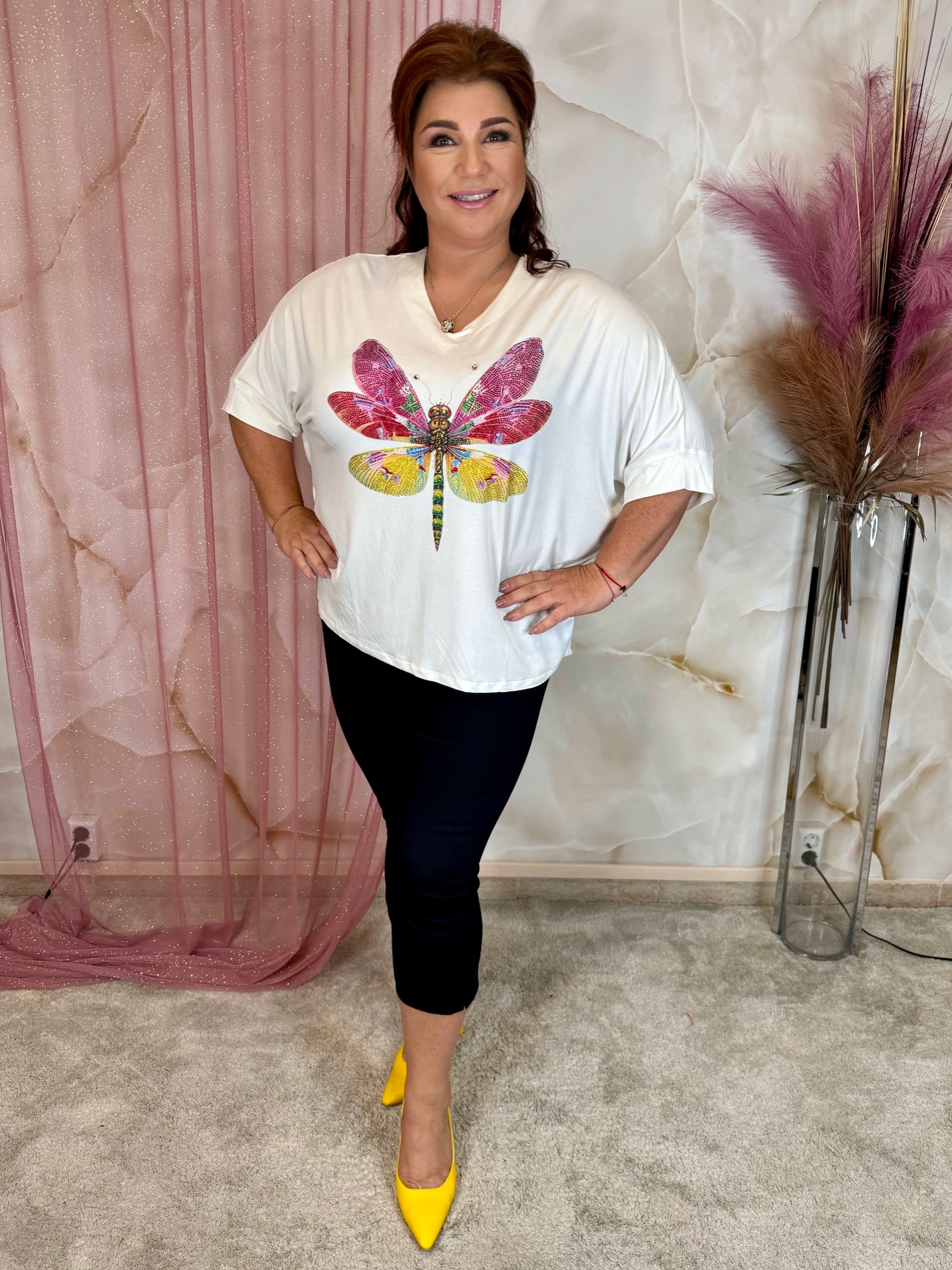 Fehér raglán ujjú szitakötős felső, elasztikus pamutból