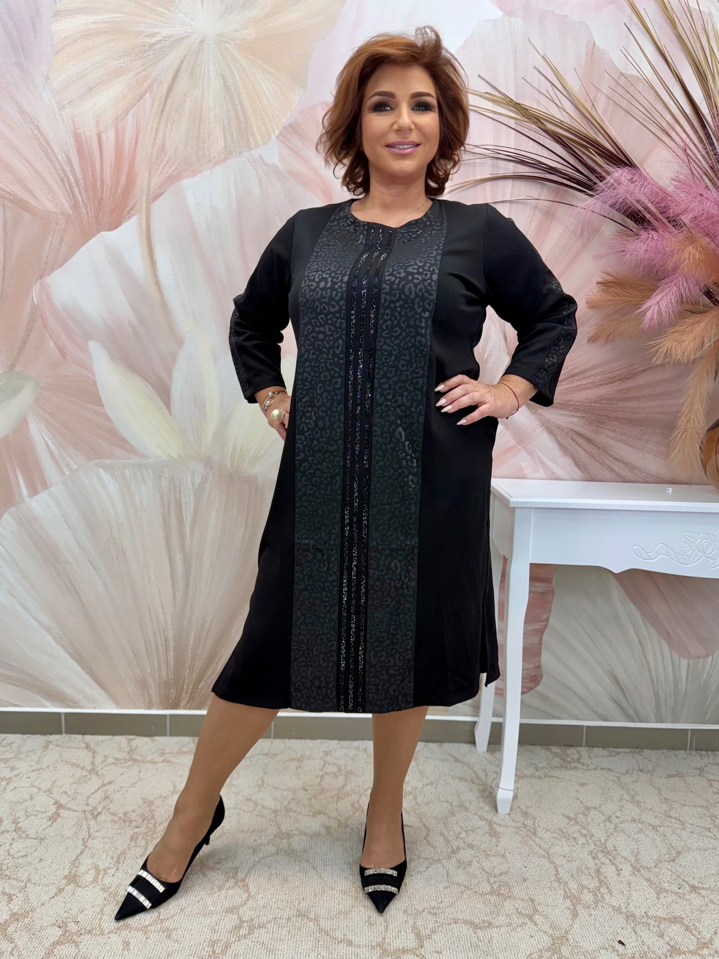 2025.11.20.Fekete bőrbetétes ocelotos pamut ruha kristályokkal