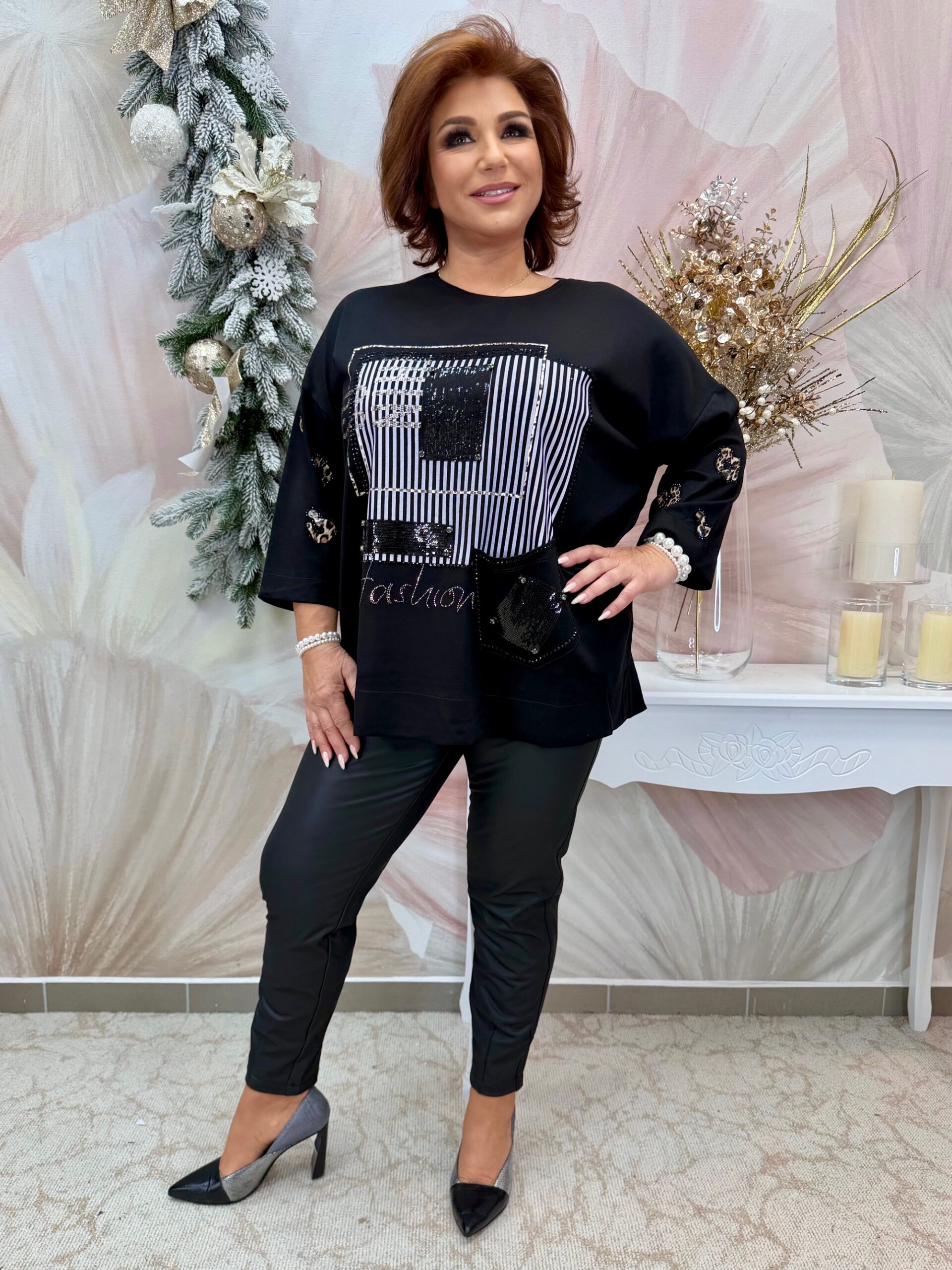 2025.11.30.Fekete csinos felső fehér és ocelotmintás díszekkel