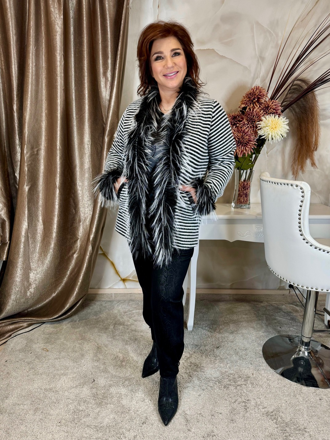 Fekete-fehér moher kardigán szőrmével elején és ujján szőrmével
