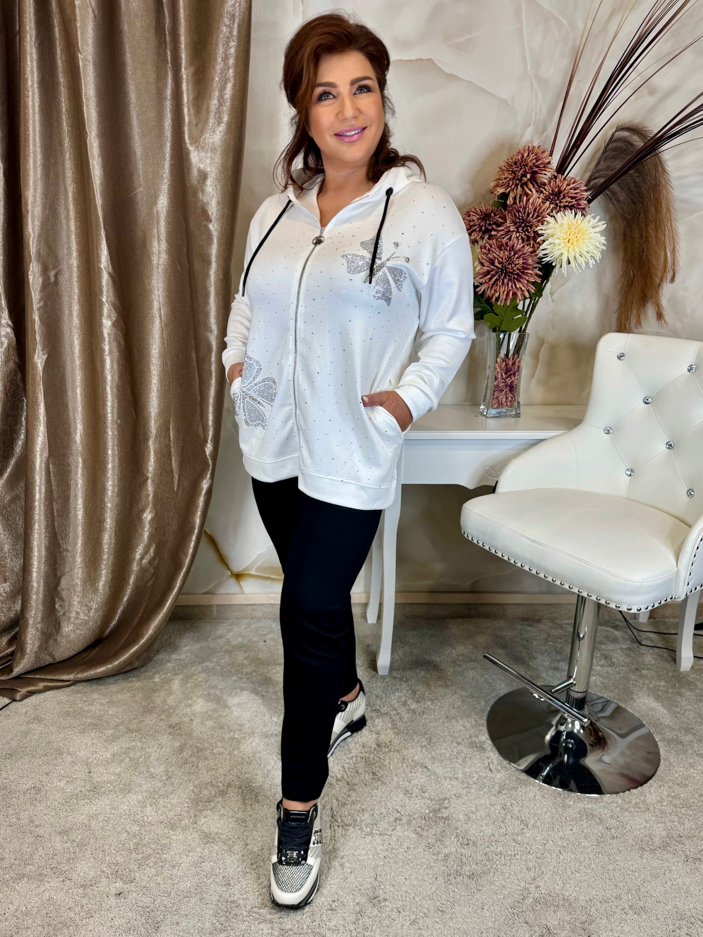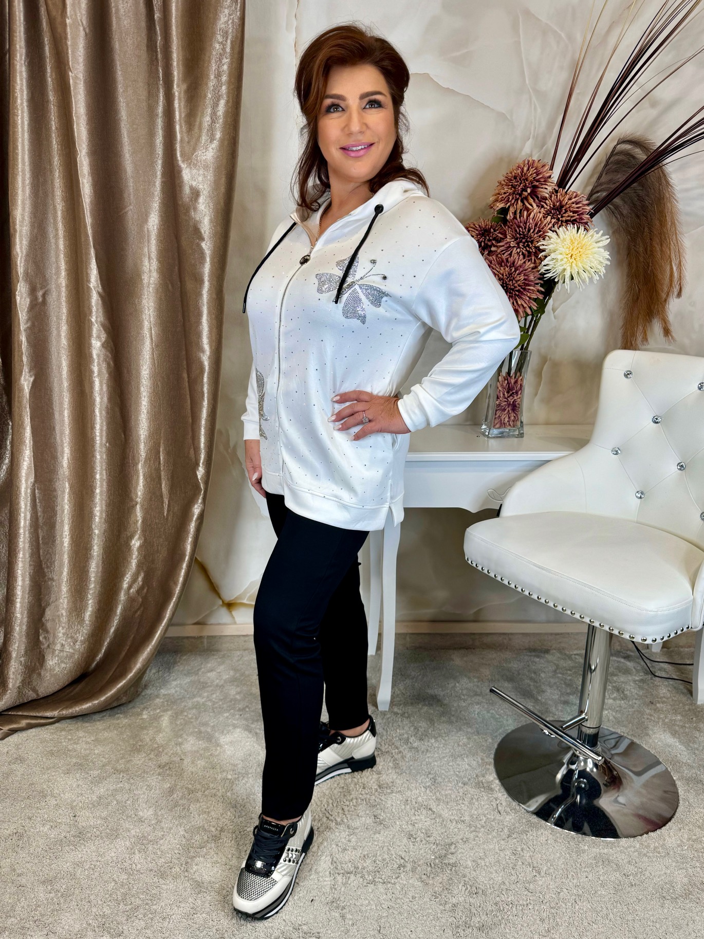 Fekete-fehér szabadidő szett pillangókkal, kapucnival, kristályokkal, fekete gumis derekú nadrággal, elasztikus pamutból