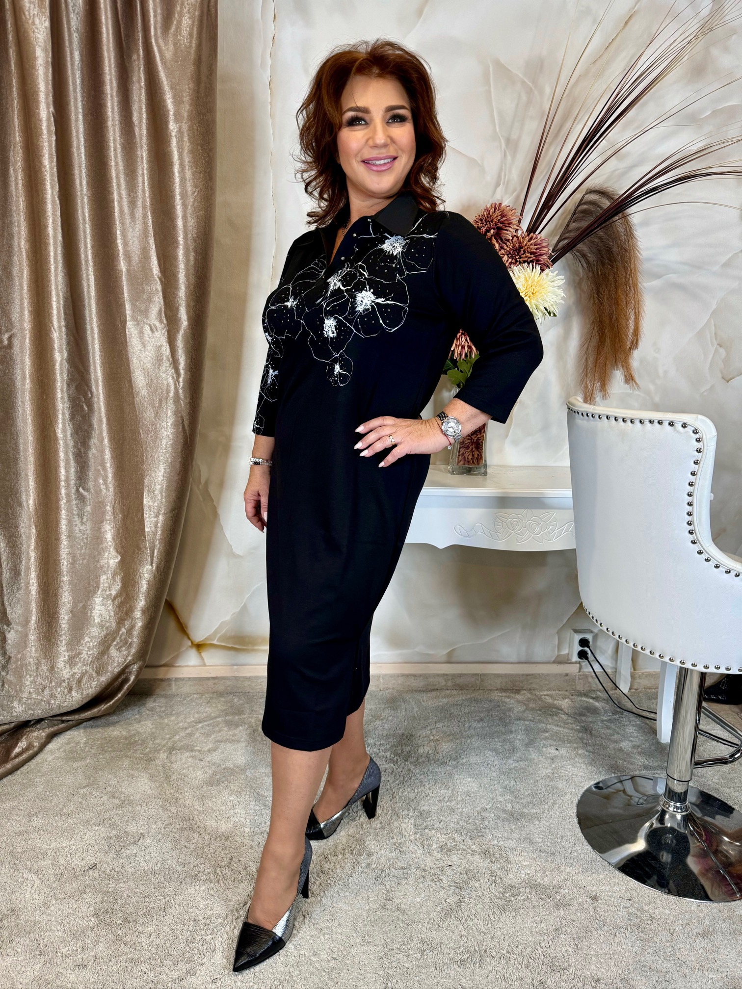 2024.11.17.Fekete galléros pamutruha fehér virágmintával
