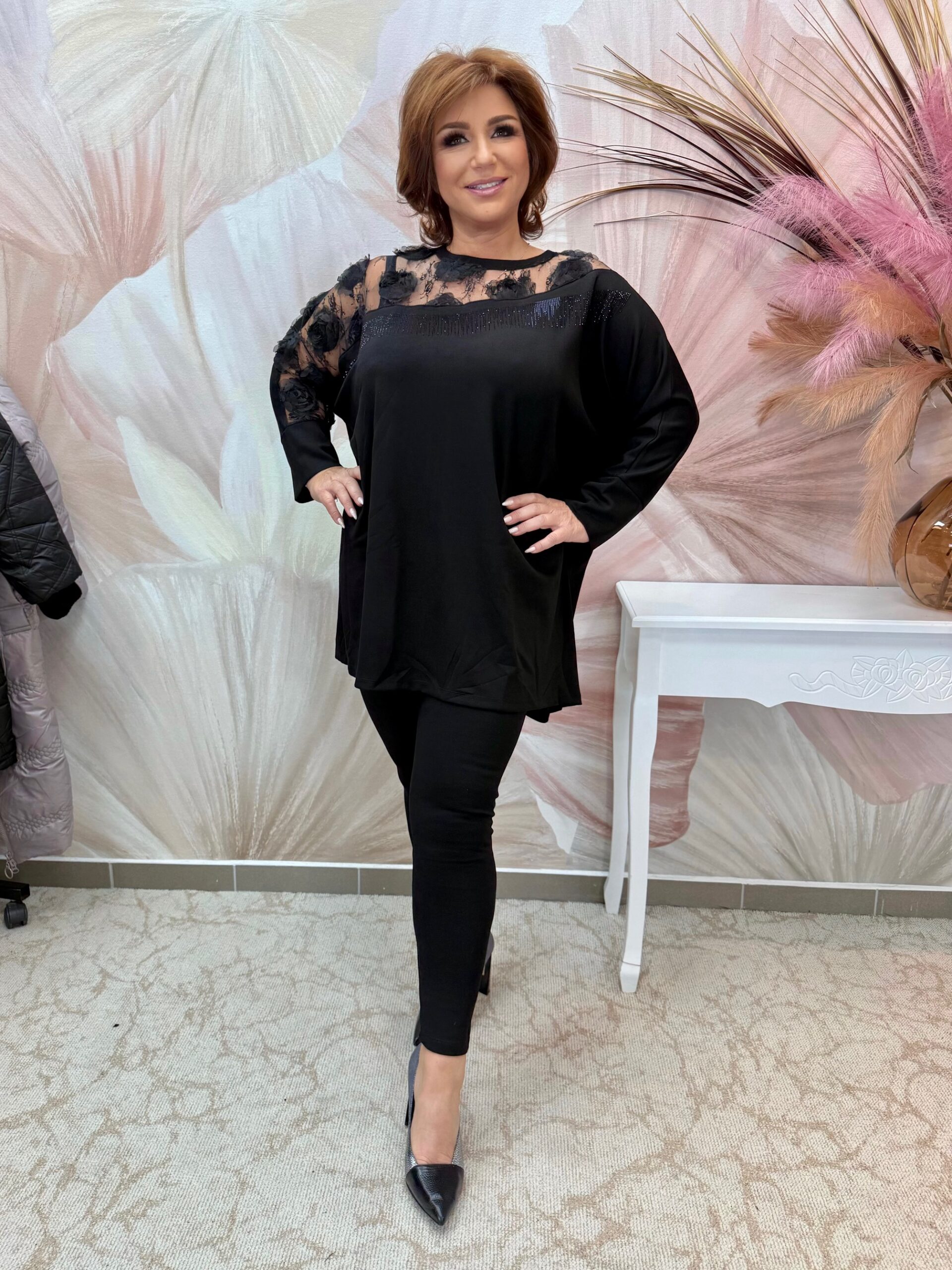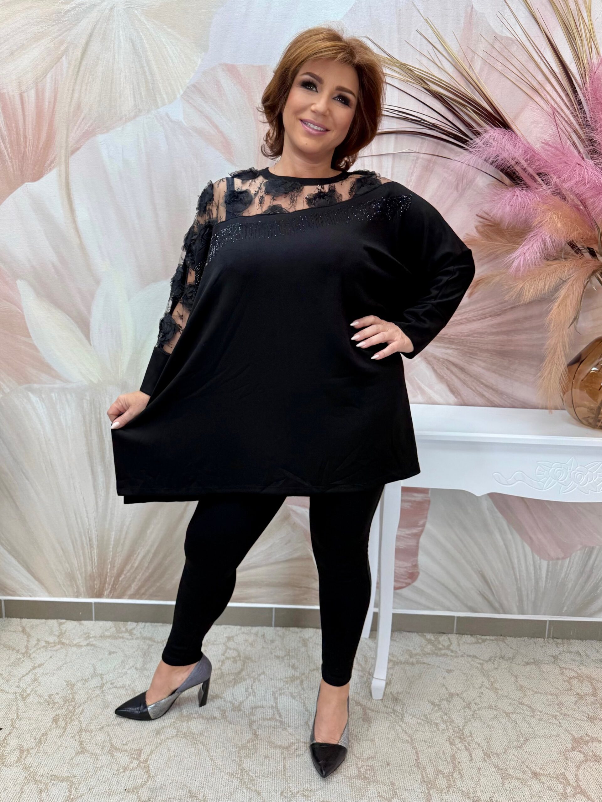 Fekete hosszított tunika tüllbetéttel, virágokkal