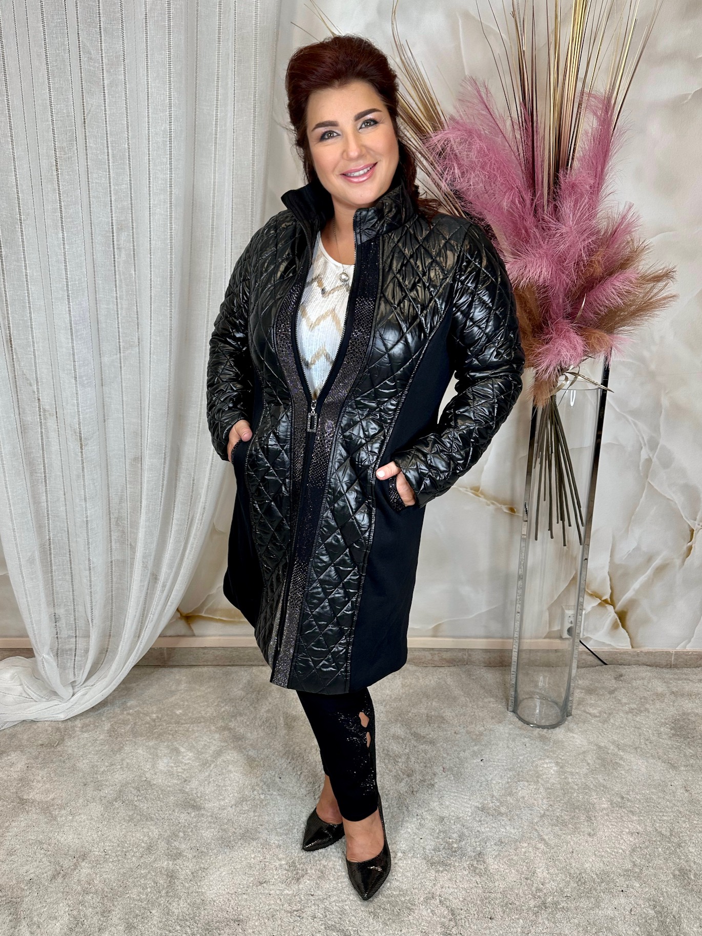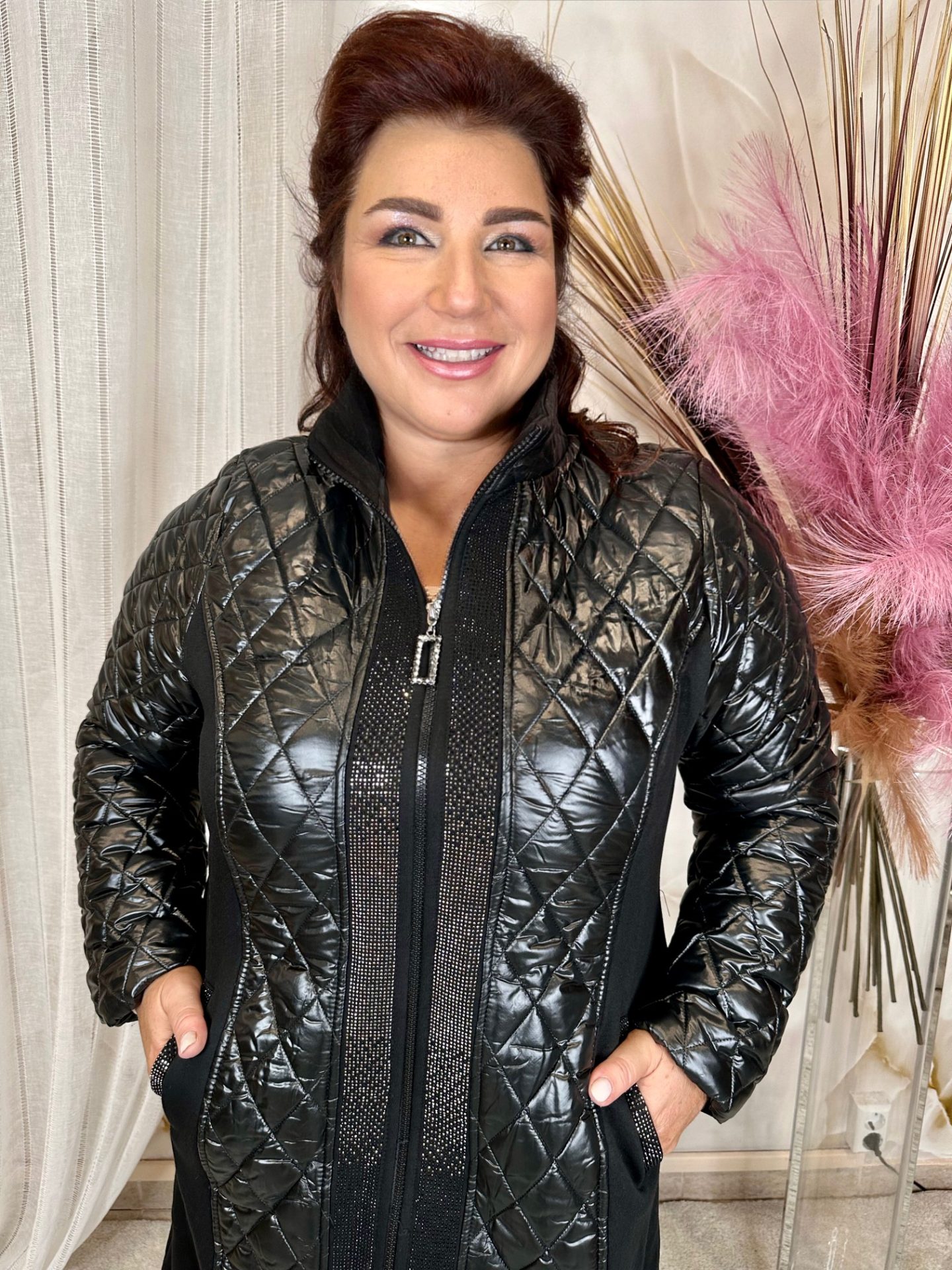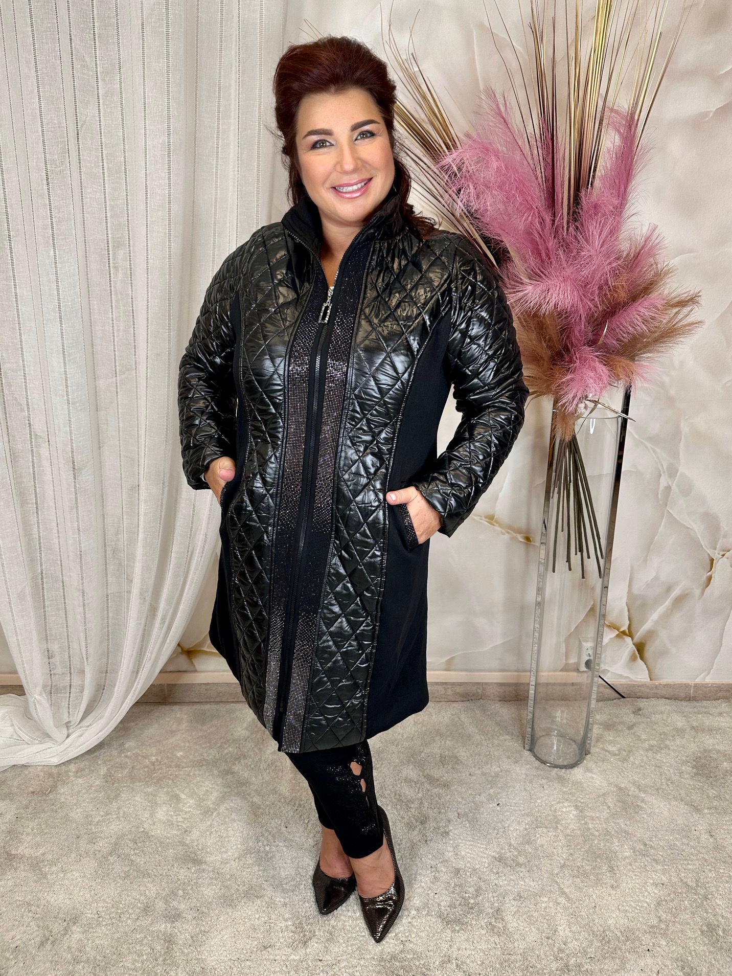 2024.09.29.Fekete hosszú kabát kristályokkal, oldalán pamut sztreccs anyagból (54-58)