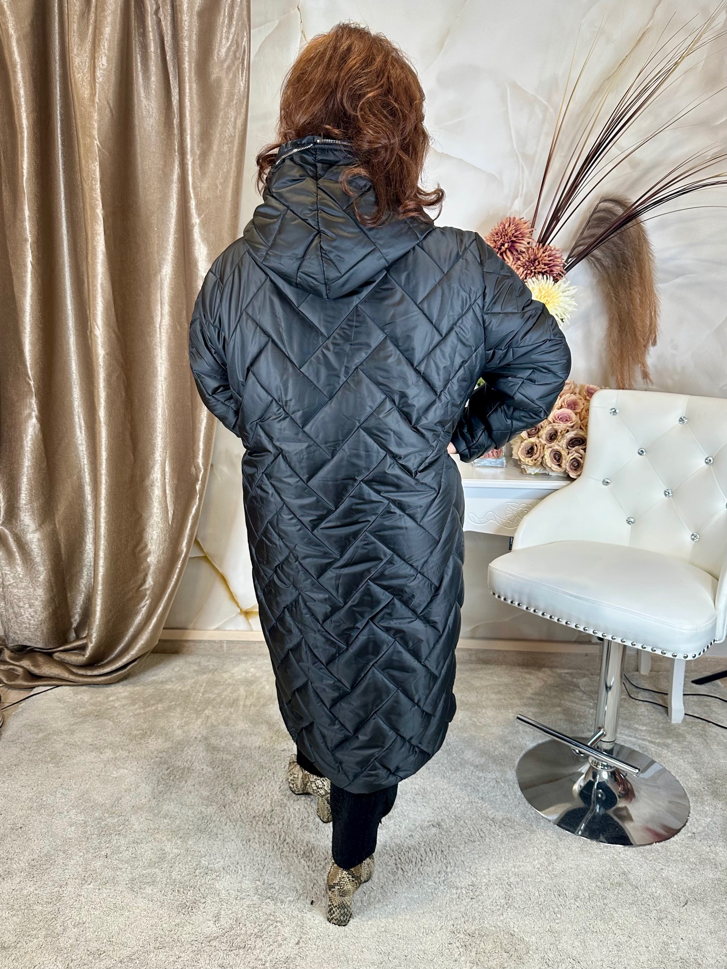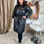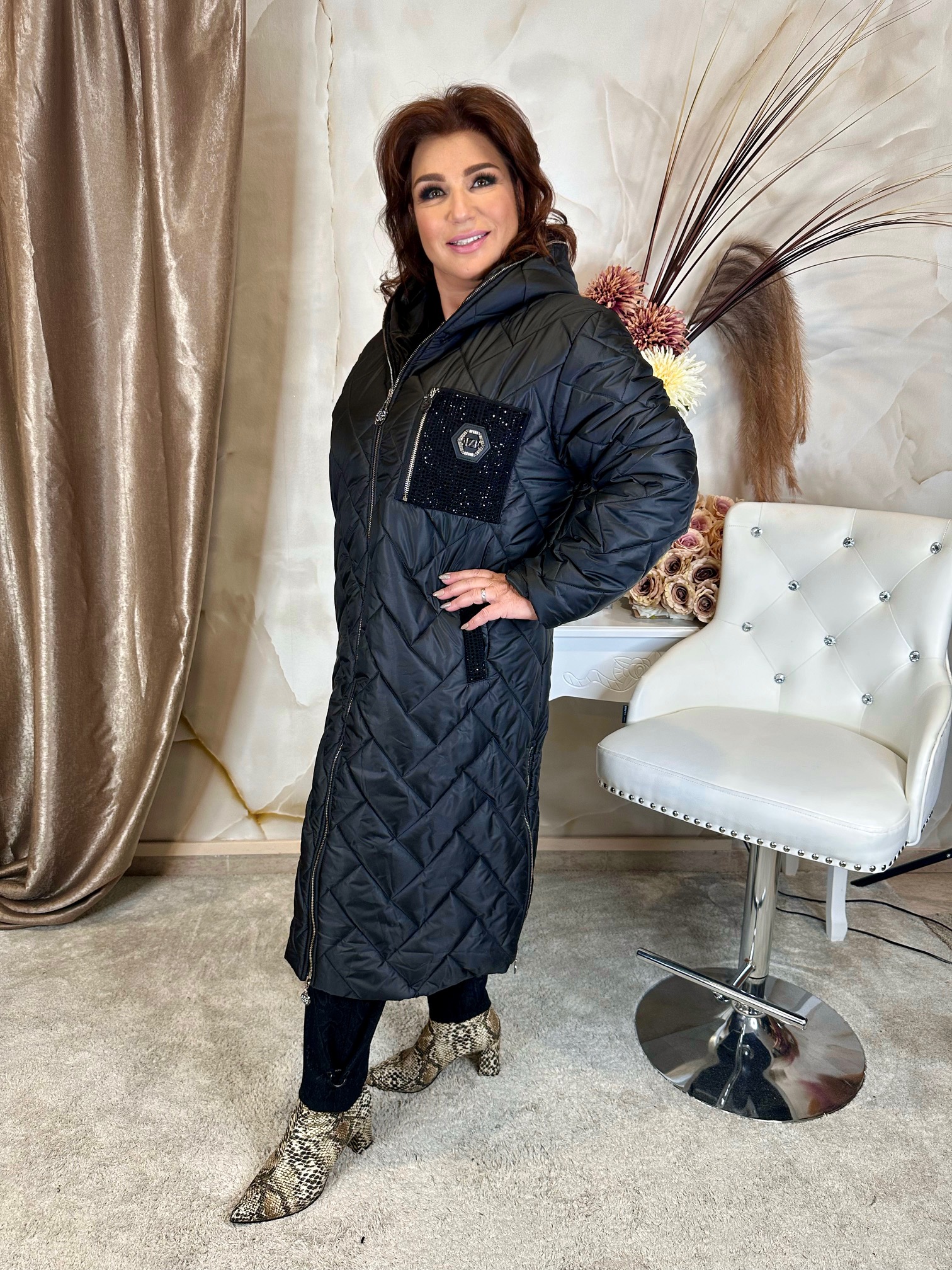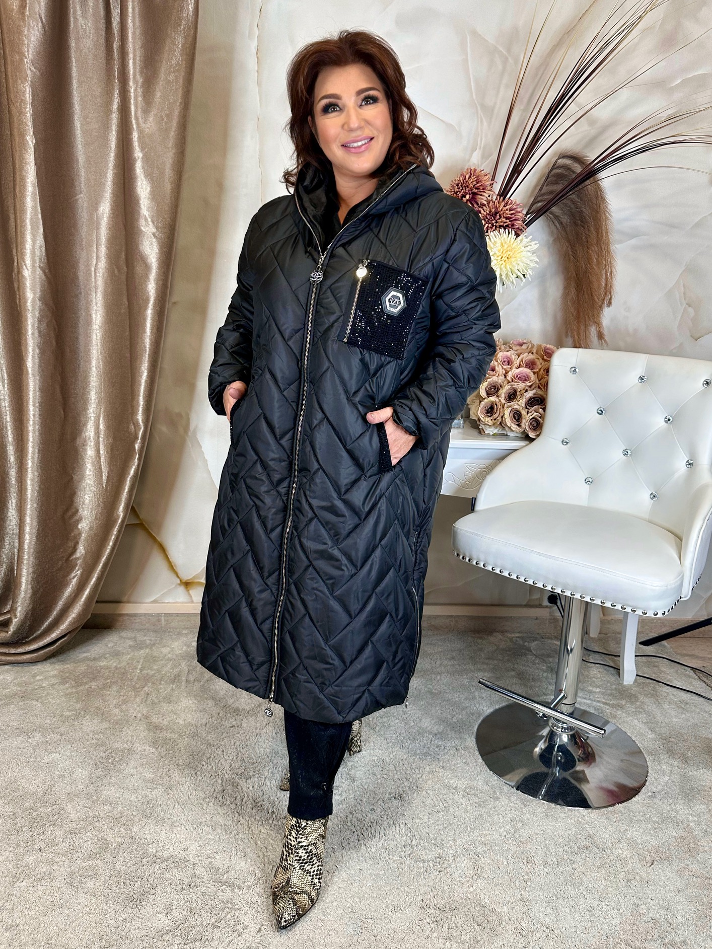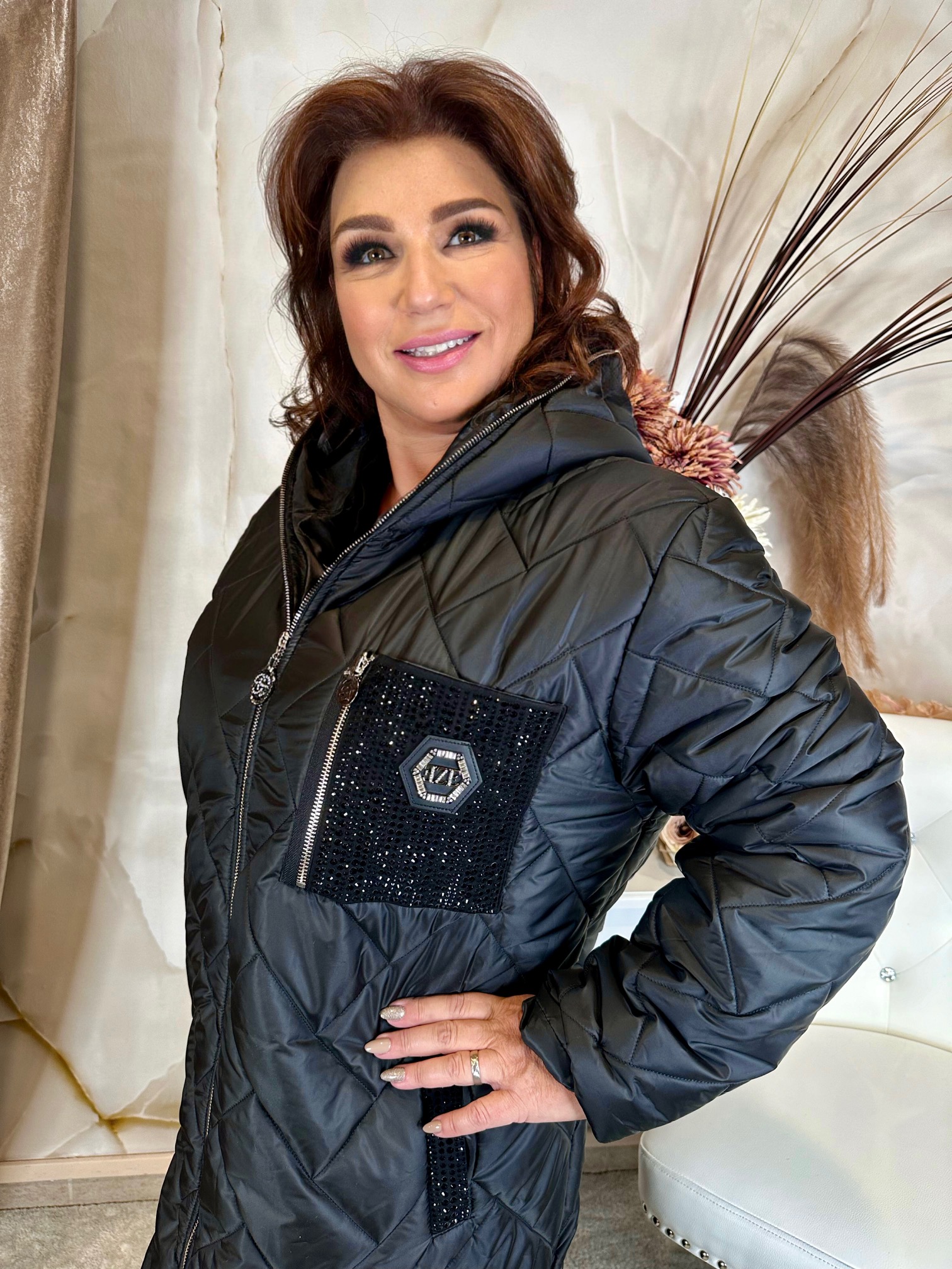 Fekete selyemfényű steppelt kabát, ezüst kristályokkal, övvel