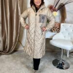 Bézs hosszú kabát mellén kristályos zsebbel, oldalán felzippelhető