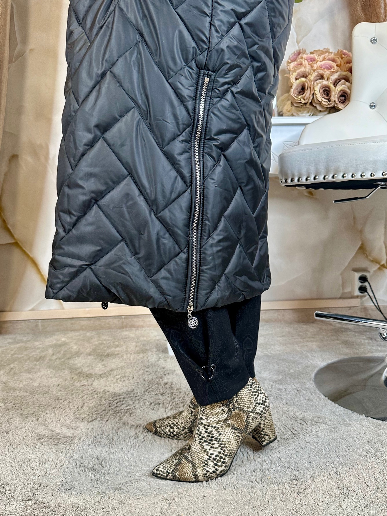2024.10.20.Fekete hosszú kabát mellén kristályos zsebbel, oldalán felzippelhető (52-58)