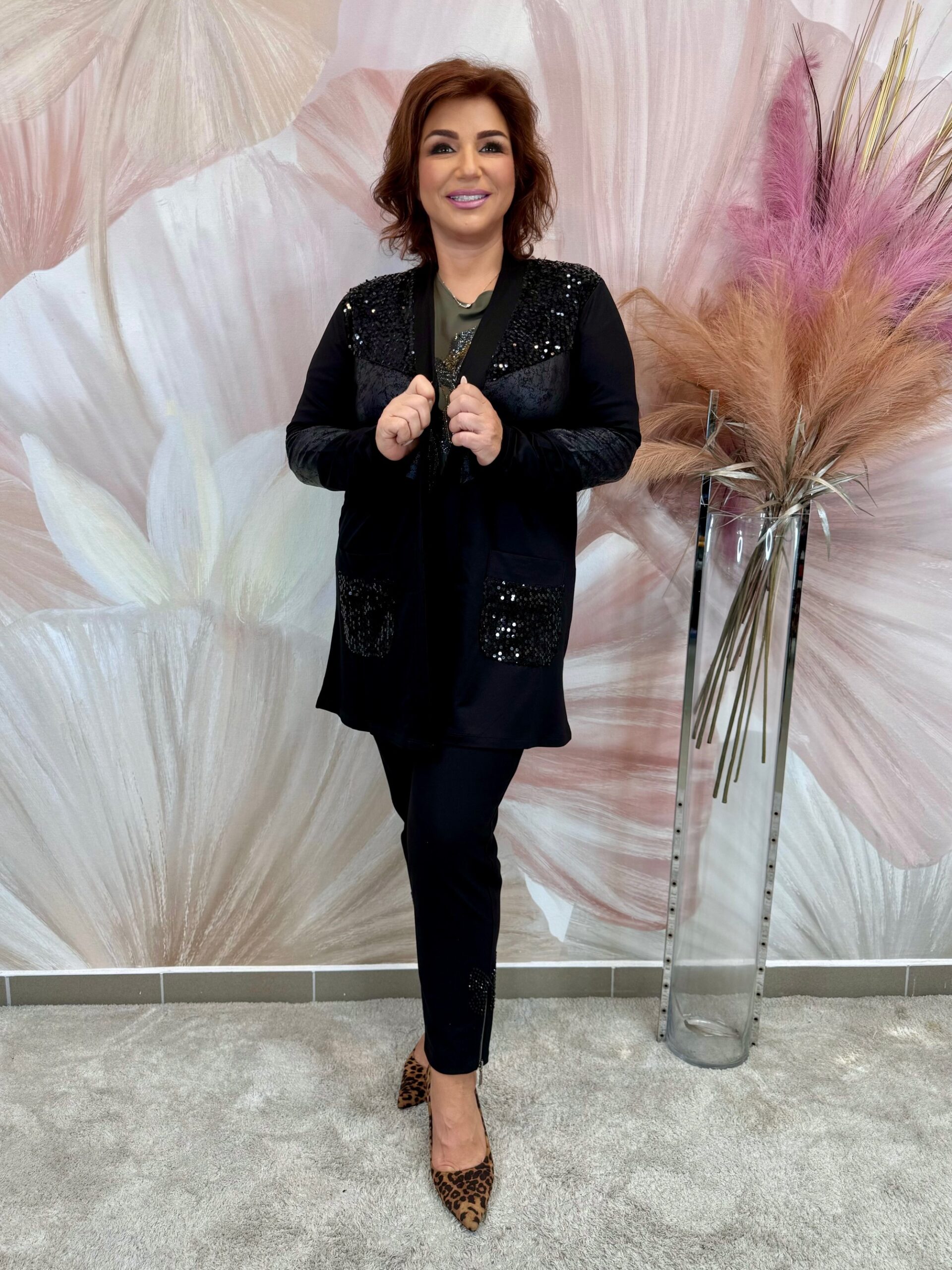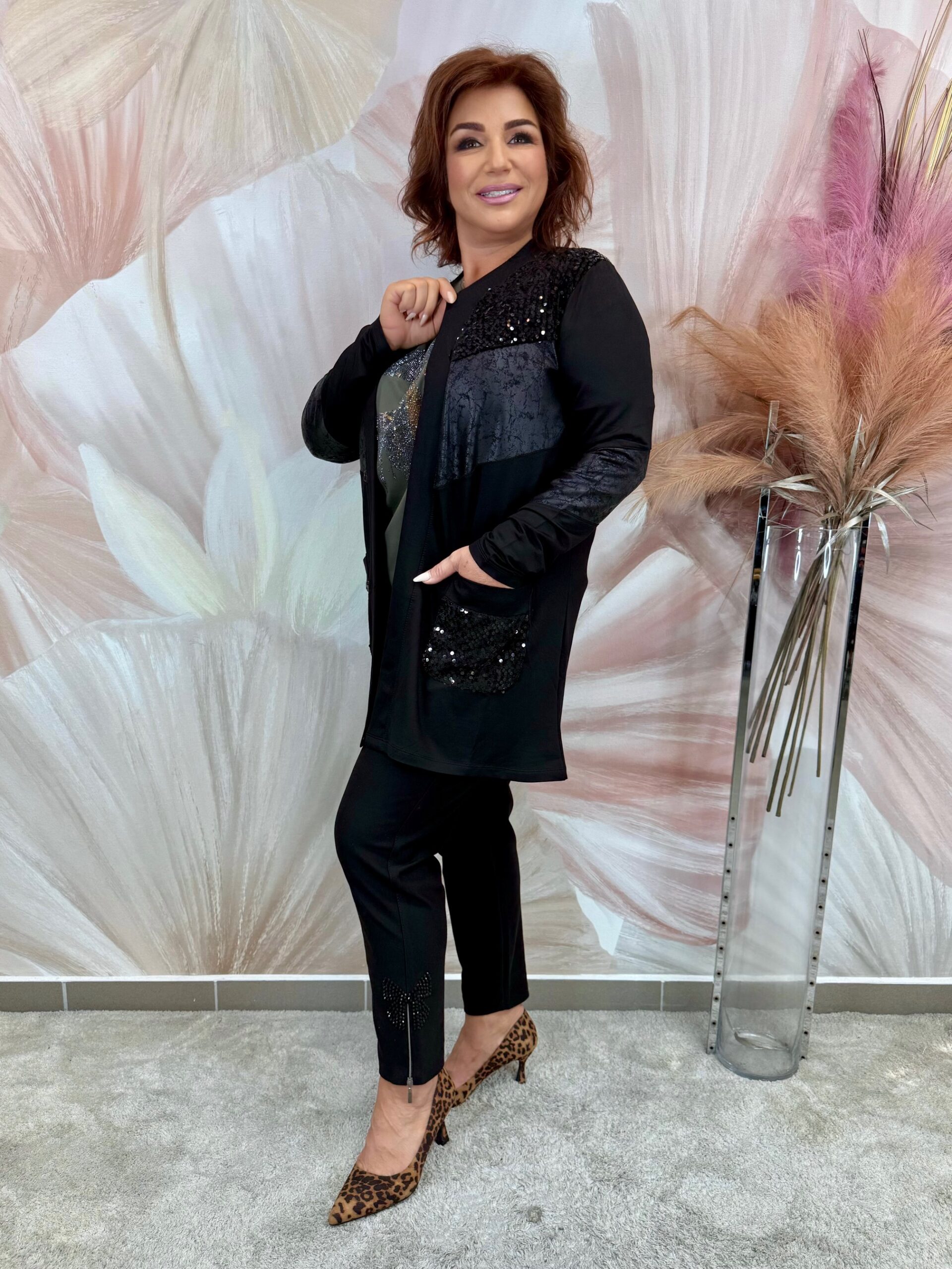 2025.09.11.Fekete pamut kardigán bőrbetéttel, flitterekkel